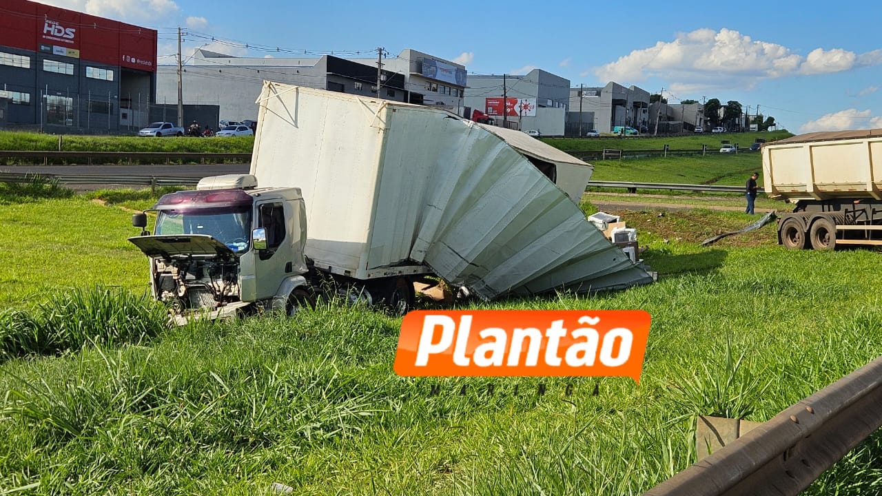 Logo atrás seguia uma carreta caçamba. O motorista percebeu a manobra inesperada e tentou frear por vários metros, mas não conseguiu evitar a colisão. O impacto foi extremamente forte: o caminhão-baú foi lançado para o canteiro central, e o peso da carga pressionou a lateral do veículo, rasgando o baú. Parte da carga, composta por fogões, ficou espalhada pela pista e pelo canteiro.