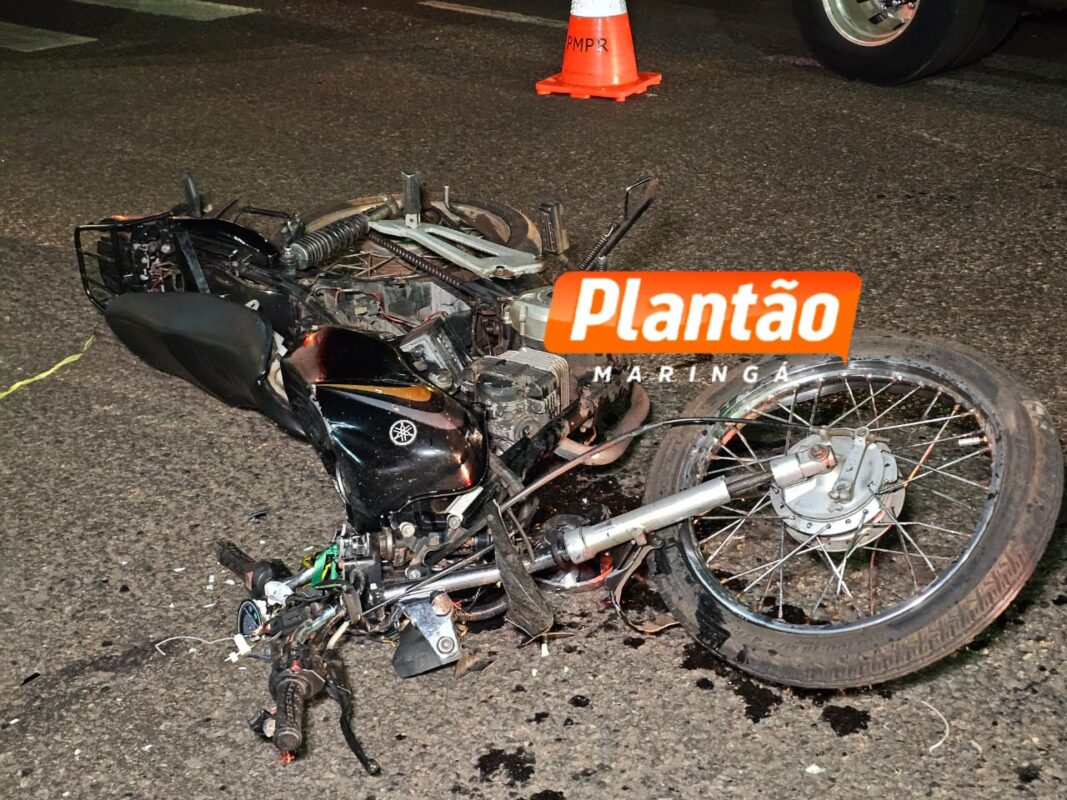 Um gravíssimo acidente foi registrado na noite desta terça-feira (24) no cruzamento da Avenida Guaiapó com a marginal da Avenida Colombo, em Maringá. A colisão envolveu uma motocicleta e um caminhão e deixou um jovem de 20 anos em estado crítico.