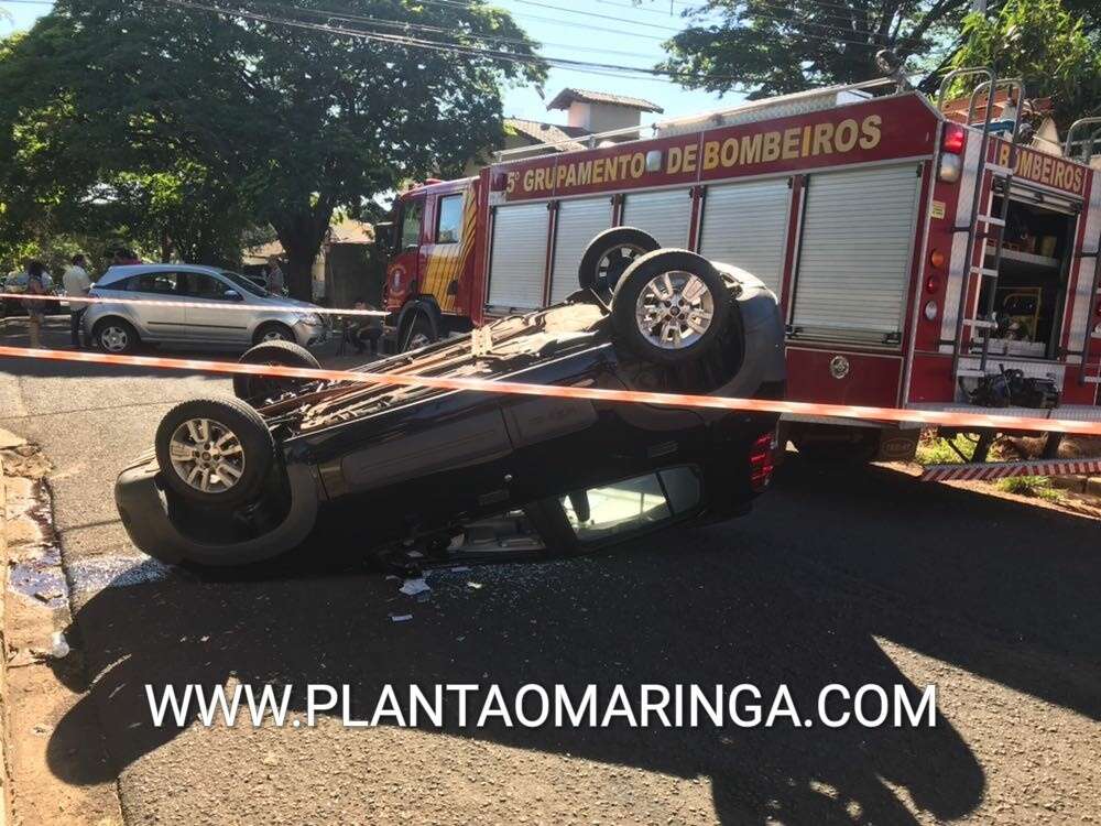 A colisão envolvendo dois carros, um Fiat Uno e Chevrolet Agile, ambas placas Maringá. Com impacto da batida o veículo Uno veio a tombar.