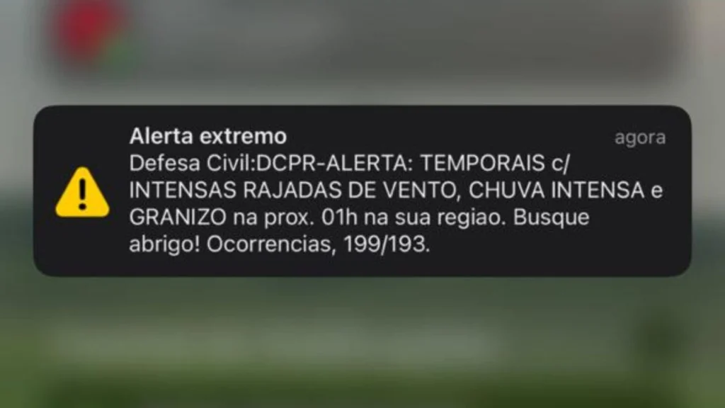 A Defesa Civil emitiu no início da noite desta sexta-feira, 12, um alerta emergencial para Maringá e municípios da região, indicando risco de temporais severos na próxima hora. O aviso, disparado diretamente nos celulares da população, veio acompanhado de um alarme estridente com apitos de emergência, chamando a atenção para a necessidade de busca imediata por locais seguros.