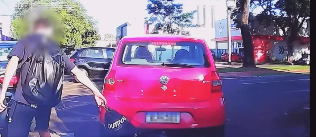 Sem perceber o que havia ocorrido, o motorista segue normalmente pela avenida. Ao notar que a bolsa ficou presa ao veículo, o jovem começa a correr atrás do carro, tentando evitar que o objeto seja levado.