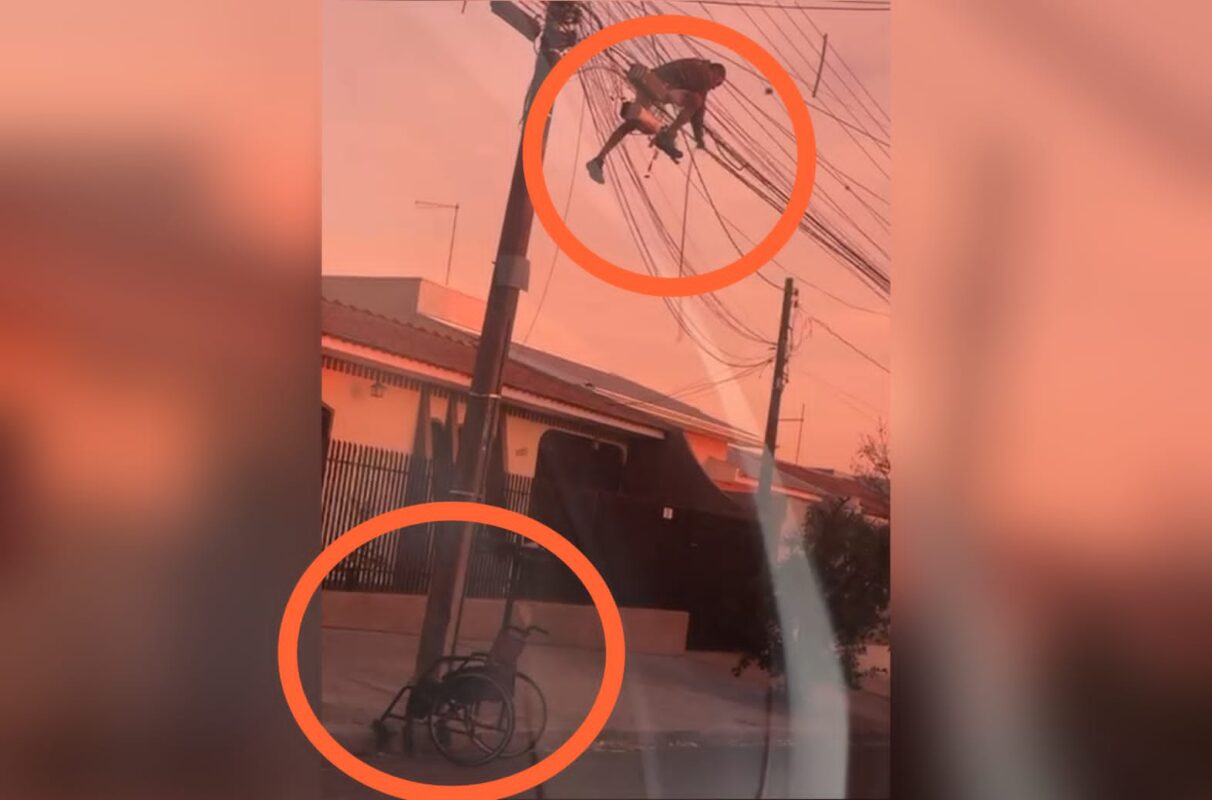Uma cena inusitada chamou a atenção de moradores do Jardim Alvorada, em Maringá. Imagens registradas por um morador mostram um cadeirante em cima de um poste furtando fiação telefônica.