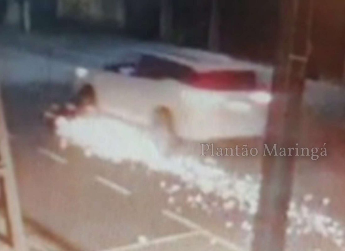 Uma câmera de segurança flagrou uma caminhonete modelo Toyota Hilux SW4 arrastando uma moto após um acidente na Rua Santos Dumont em Maringá, na início da manhã desta quinta-feira (09). Veja o vídeo do flagrante aqui
