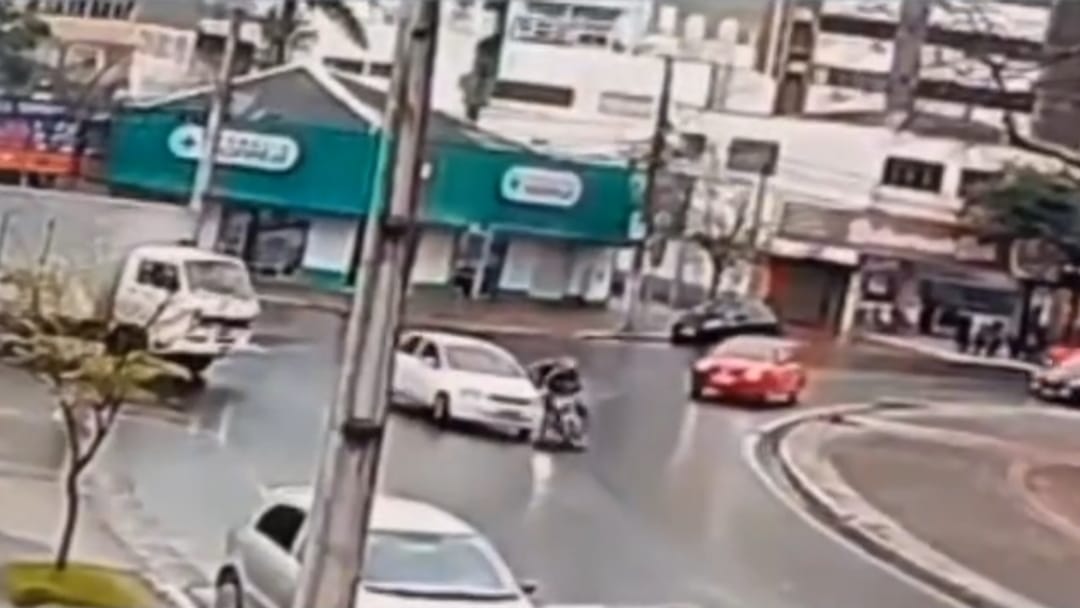 Nas imagens, é possível ver o momento em que o motociclista trafega pela pista da esquerda, enquanto um veículo que descia pela Avenida Brasil entra na rotatória sem perceber a aproximação da moto. A manobra resulta na colisão entre os dois.