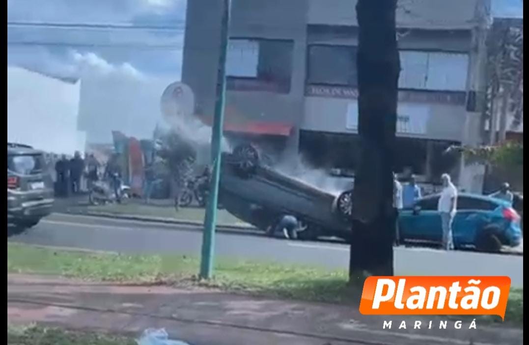 Um acidente envolvendo dois veículos foi registrado na tarde desta segunda-feira (14), na Avenida Mandacaru, nas proximidades do Hospital Universitário, em Maringá. Imagens de câmeras de segurança mostram o momento em que ocorre a colisão, que resulta no capotamento de um dos carros.