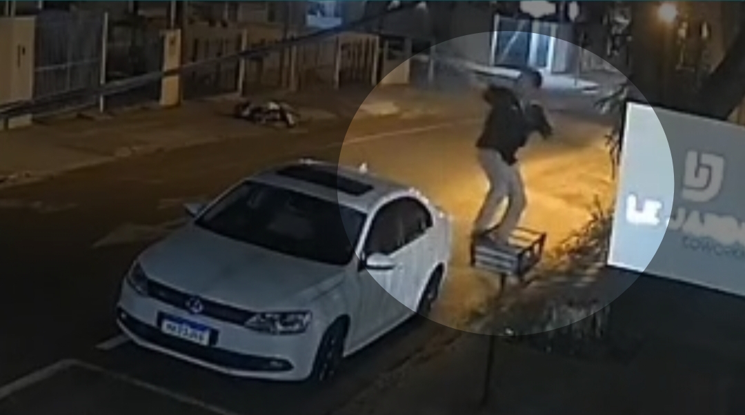 Nas imagens, é possível ver o suspeito chegando em um carro Jetta. O suspeito desce do veículo, vai até o porta-malas para pegar um objeto cortante e, em seguida, sobe em uma lixeira. Pendurado, o homem corta os fios e, após a ação, acaba caindo. Mesmo assim, ele se levanta e deixa o local normalmente.