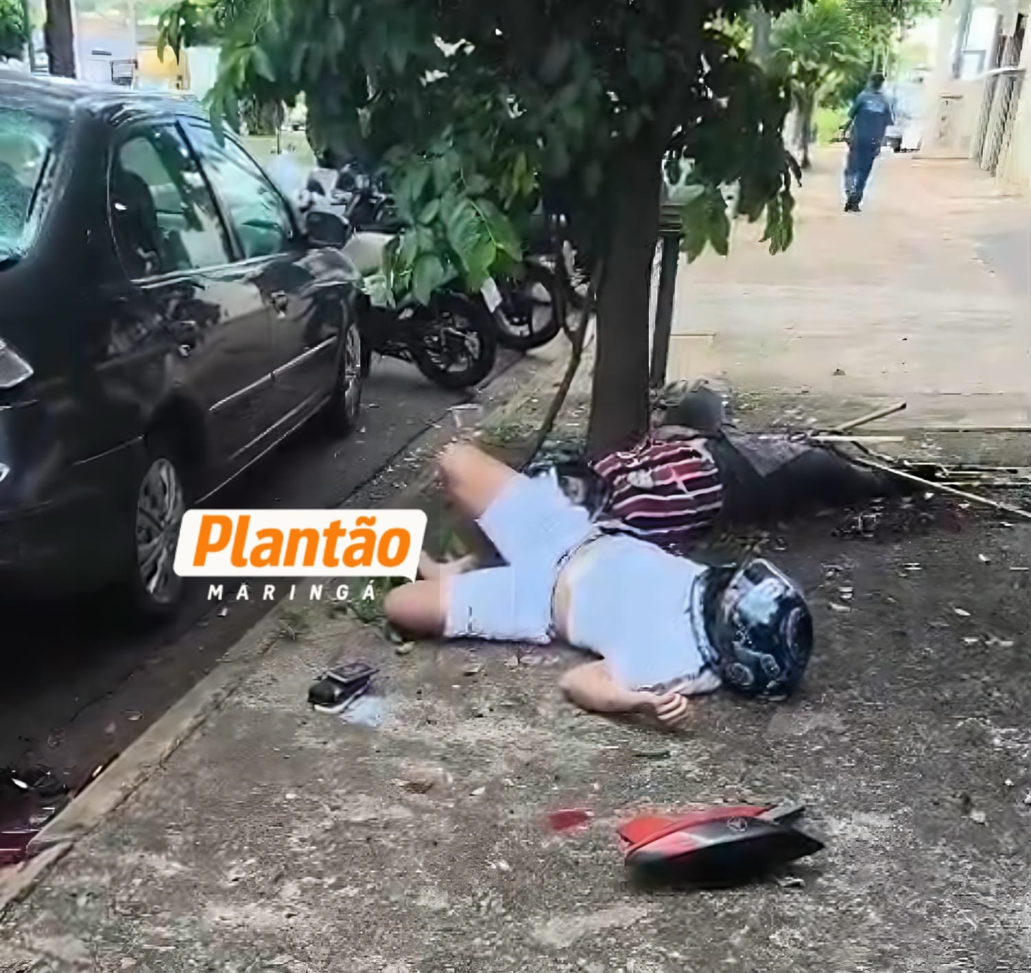 Pelas imagens, é possível ver o motociclista descendo a avenida e batendo com violência contra um carro estacionado. Os dois jovens que estavam na moto foram arremessados contra uma árvore.