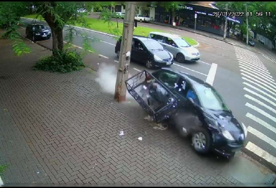 Imagens de câmeras de segurança mostram o momento exato em que o motorista do Peugeot, para não bater em dois carros que estavam parados no sinal, joga o veículo para a calçada e atinge uma lixeira e a estrutura do sinaleiro. Veja o vídeo aqui