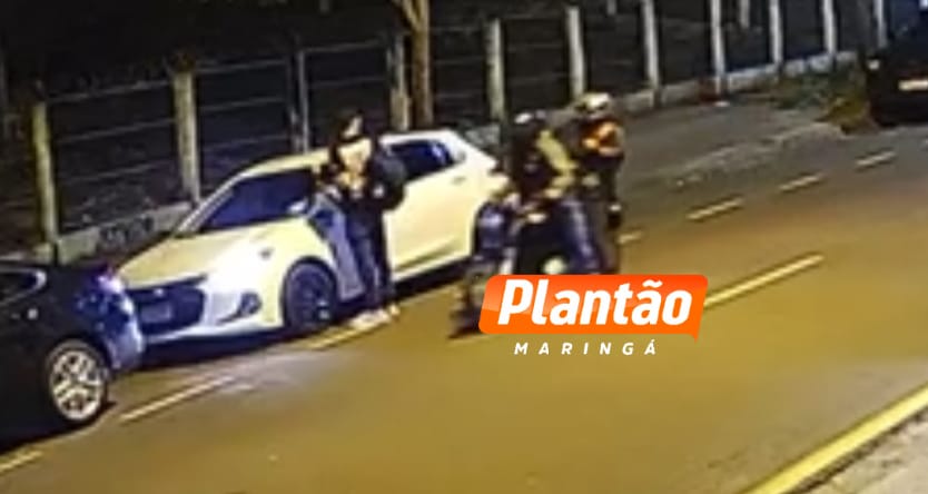 Uma câmera de segurança flagrou o momento em que um motorista foi vítima de um assalto na noite do último domingo (18), na Avenida Londrina, no bairro Jardim Aclimação, em Maringá. Nas imagens é possível ver quando o condutor do veículo desce do carro e, em seguida, é surpreendido por dois homens em uma motocicleta. Um deles estava armado e, mediante ameaças, anunciou o assalto.