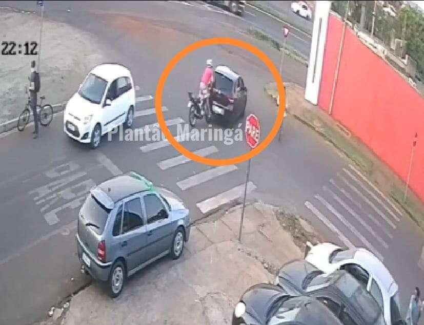 A imagem mostra a moto seguindo Rua David Pavão, quando no cruzamento com a Rua José Galindo García, o motociclista tenta desviar de um carro e acaba batendo na traseira de outro veículo.