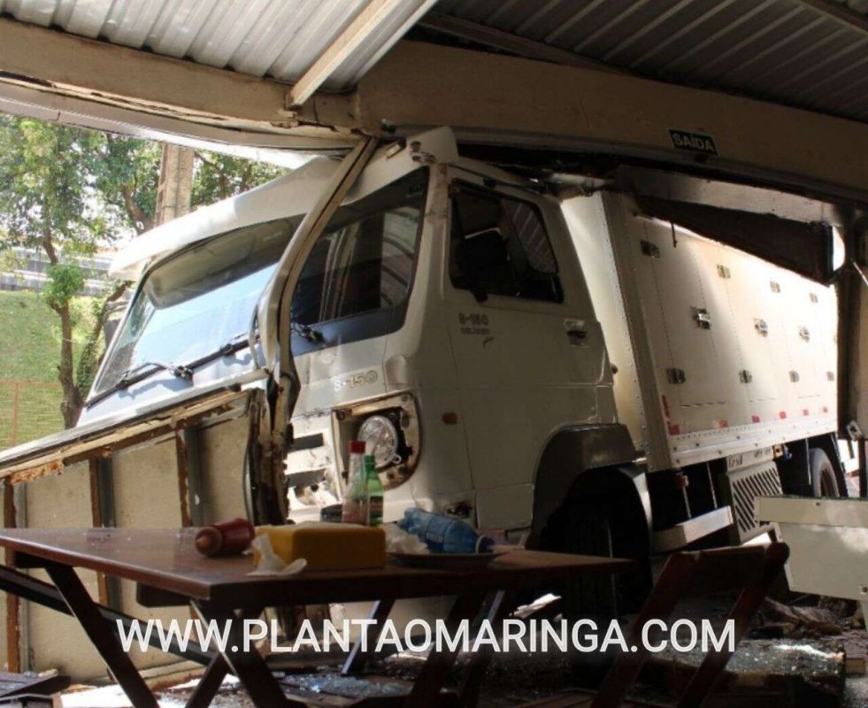 Um caminhão de entregas destruiu a parede de um restaurante na hora do almoço desta quarta-feira (25), no Jardim Aclimação em Maringá. Uma adolescente ficou ferida. O veículo havia descarregado no Unicesumar e no momento em que deixava as independências da faculdade, o motorista teria passado mal e perdido o controle da direção, e só parou quando bateu na parede do estabelecimento.O impacto foi tão grande que uma cliente do restaurante acabou se ferindo com estilhaços de vidros. Por pouco, não houve uma tragédia, que varias pessoas almoçavam na hora do acidente. A adolescente foi encaminhada ao hospital Universitário com ferimentos leves. Já o motorista do caminhão recusou atendimento.