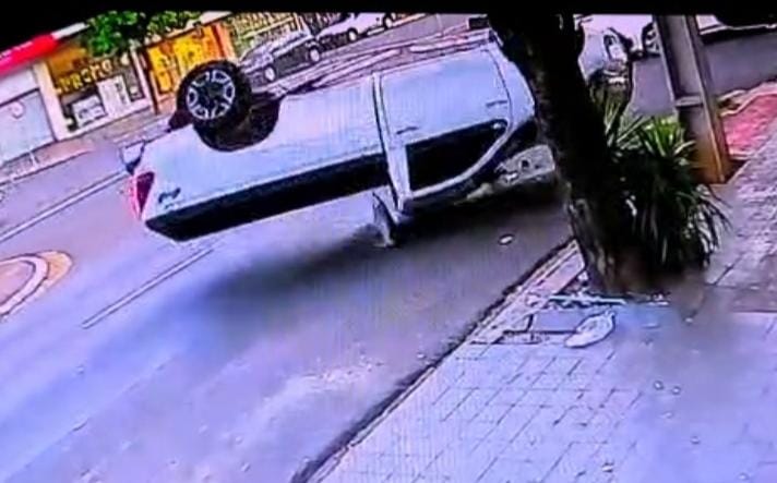 Um acidente envolvendo dois veículos chamou a atenção de quem passava pela Avenida Paraná em Maringá, na manhã desta sexta-feira, 19. Imagens de câmera de segurança registraram o momento em que uma caminhonete Hilux branca é atingida por um Ônix, também de cor branca e capota na via.