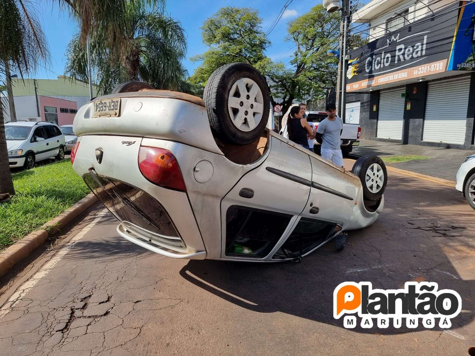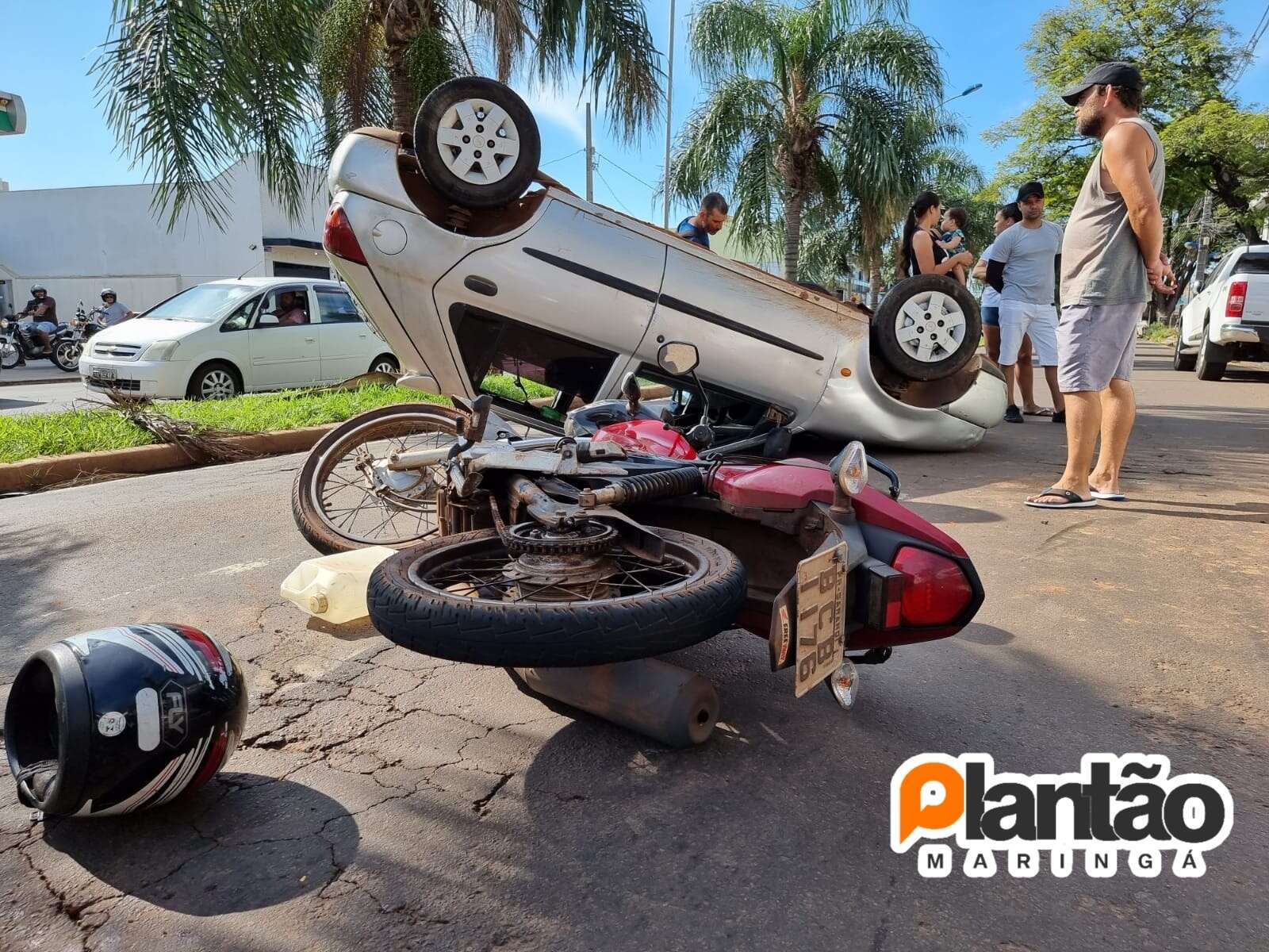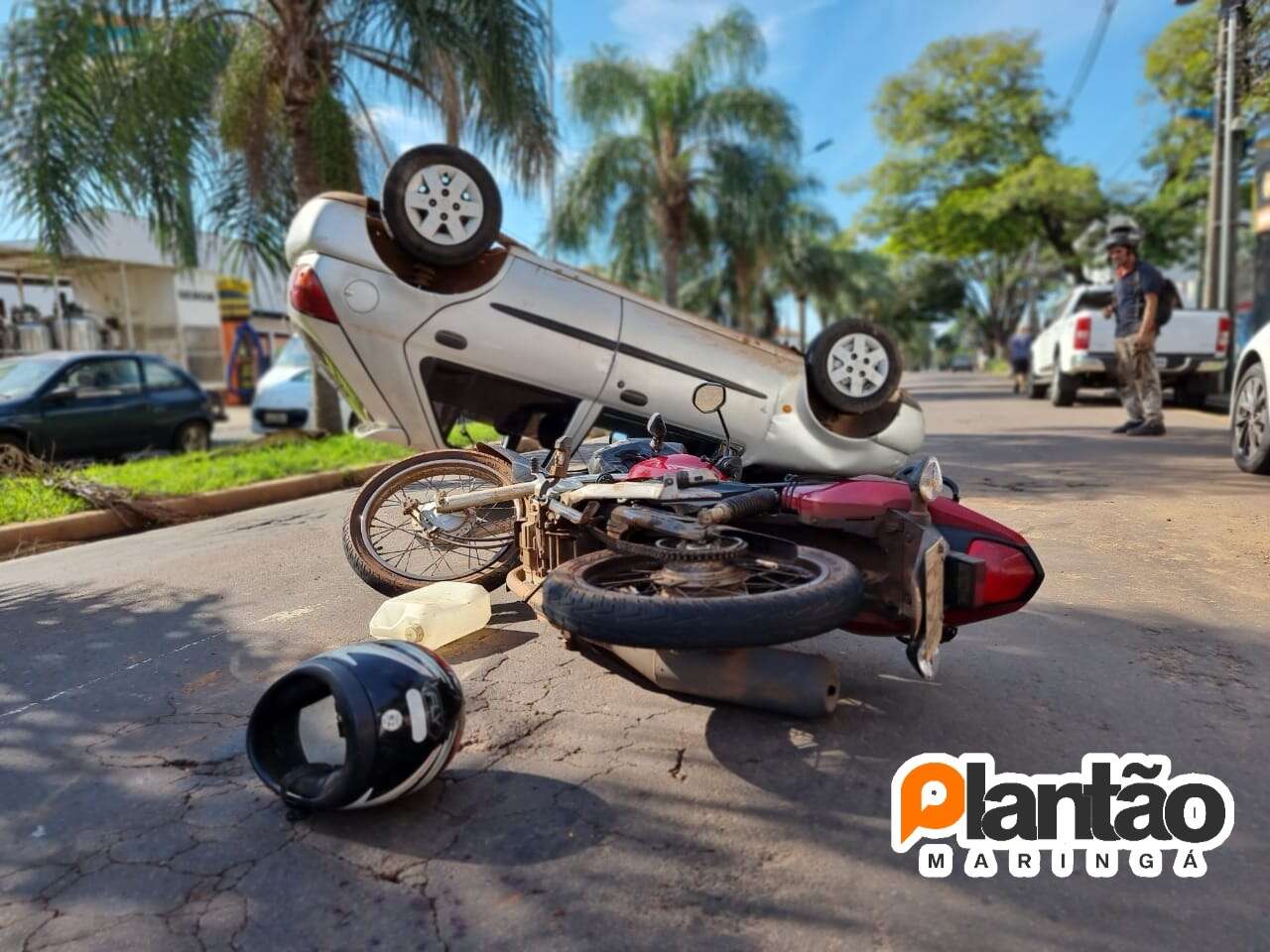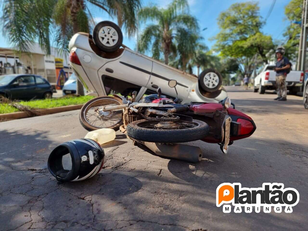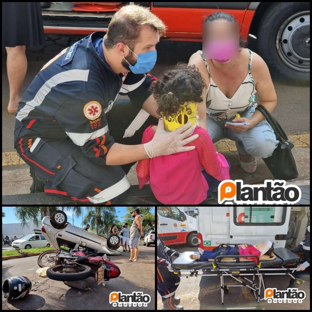 Um carro capotou na tarde deste sábado (09), após uma colisão com uma motocicleta e um veículo estacionado em Maringá. Sigam nosso Instagram