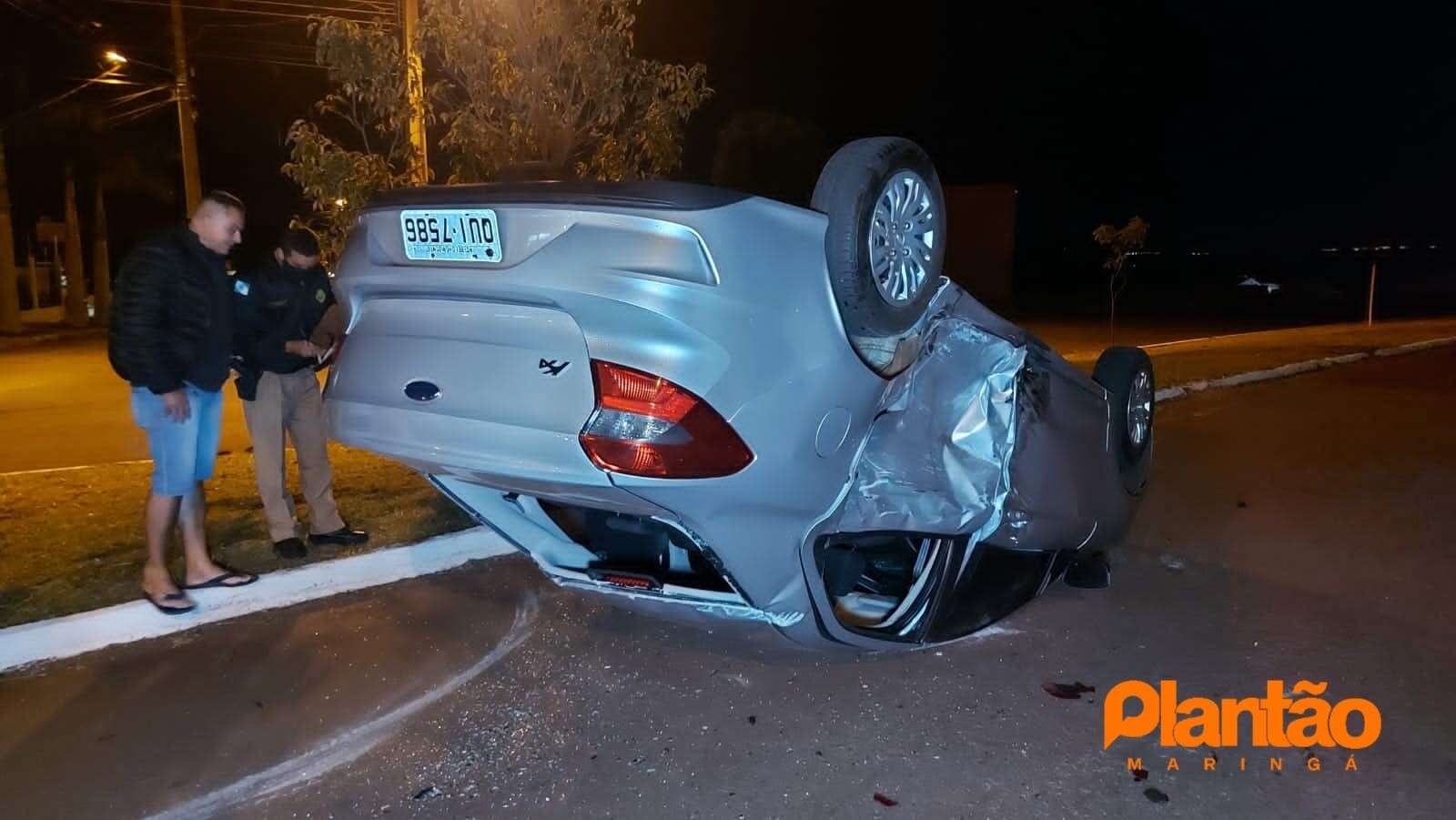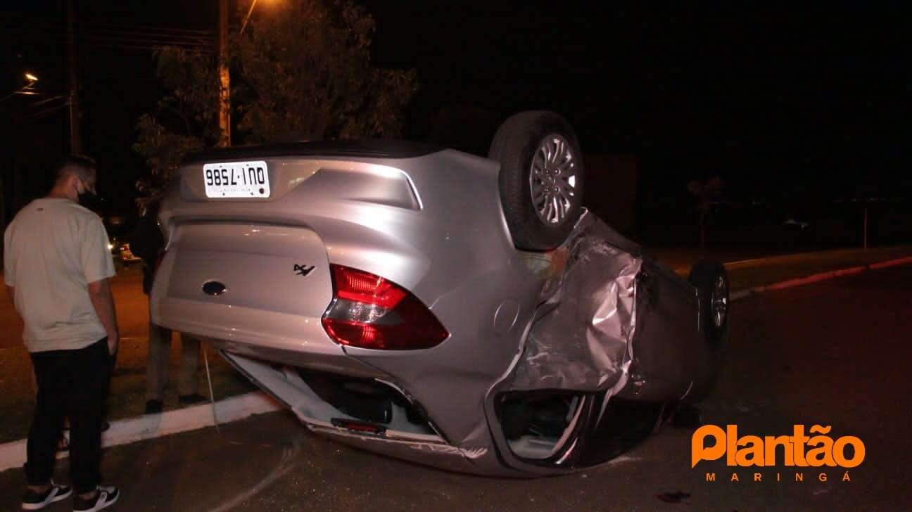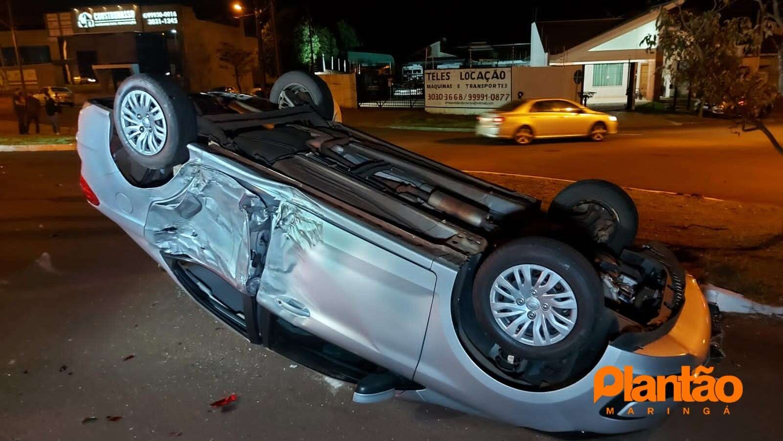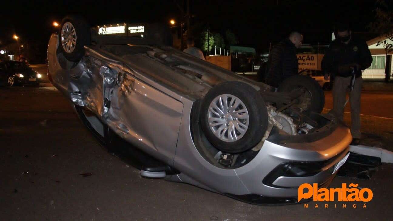 Um carro capotou após ser atingido na lateral por uma motocicleta de alta cilindrada no bairro Parque Avenida, na noite deste sábado (07), em Maringá. Segundo o Corpo de Bombeiros, uma pessoa teve ferimentos leves, e foi encaminhada ao hospital.