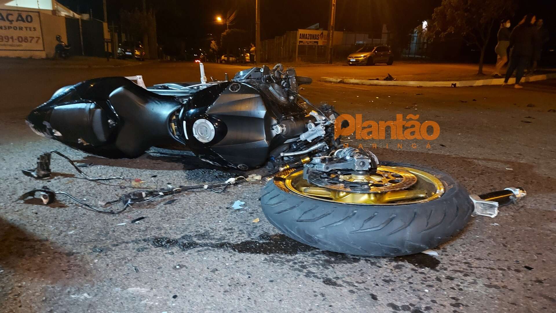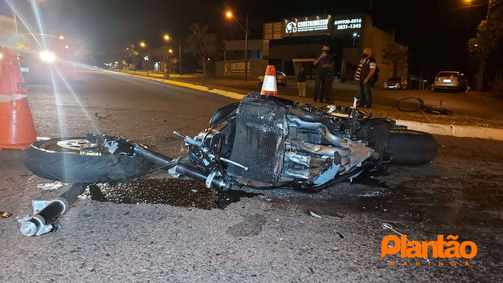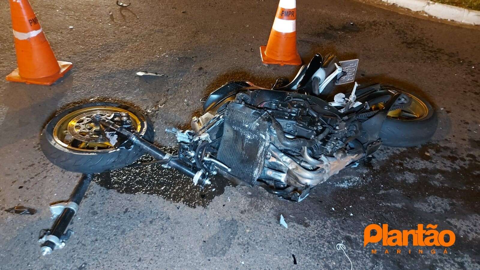 Com o impacto, o veículo capotou. A moto ficou completamente destruída. A roda da frente chegou a ser arrancada ficando segura apenas por cabos.