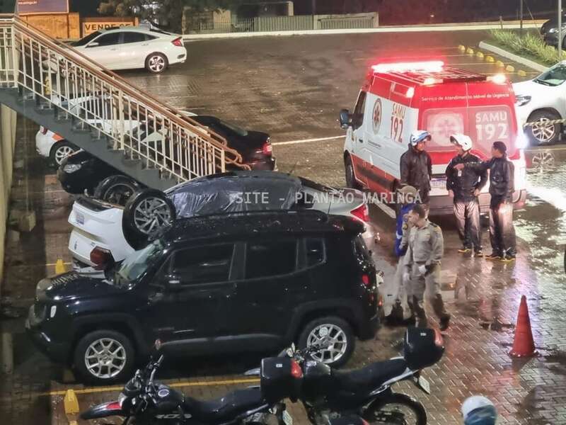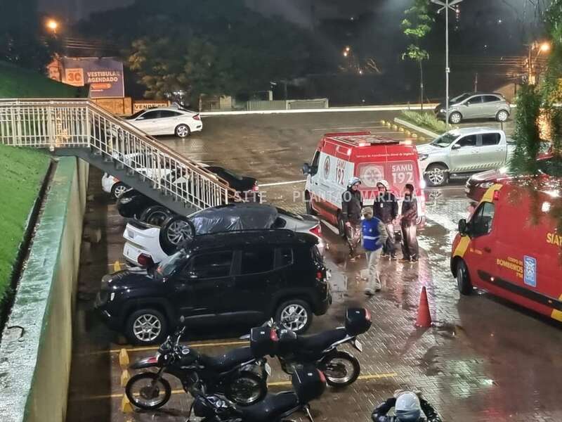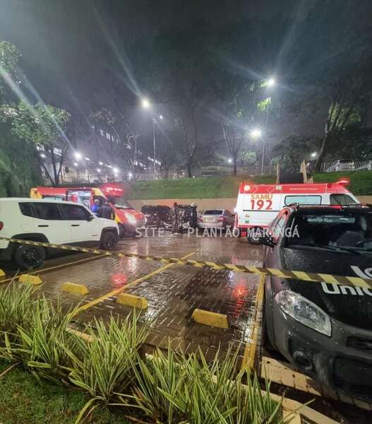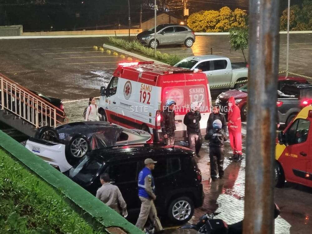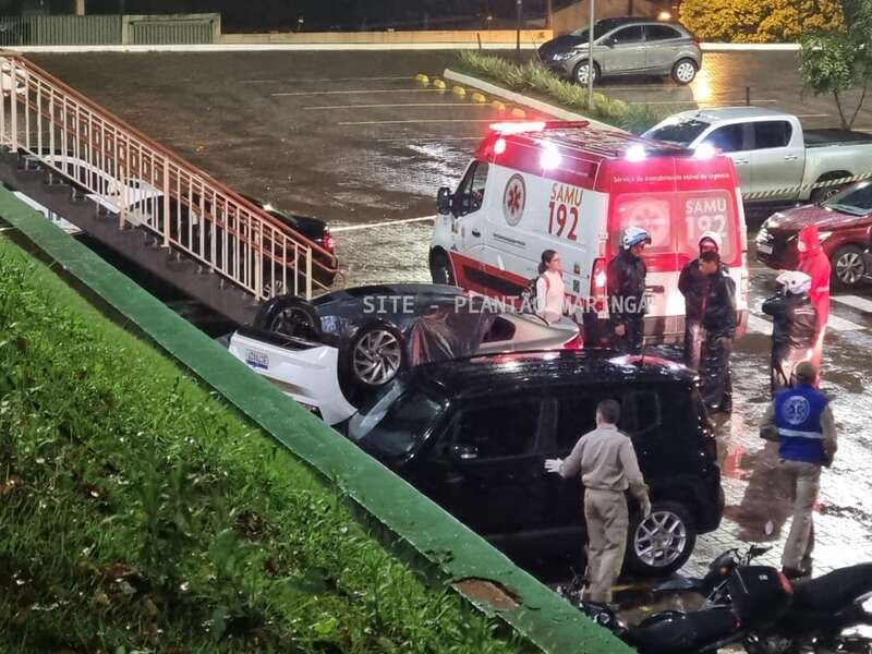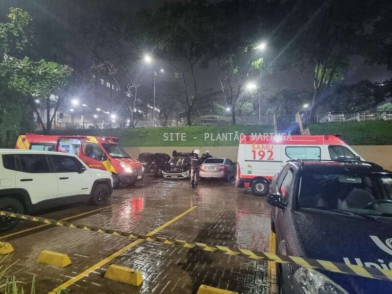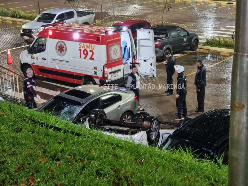 Duas mulheres e um rapaz ficaram feridos depois que o carro em que eles estavam caiu de um estacionamento da Unicesumar, em Maringá, na noite desta quarta-feira (14).