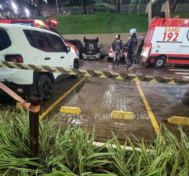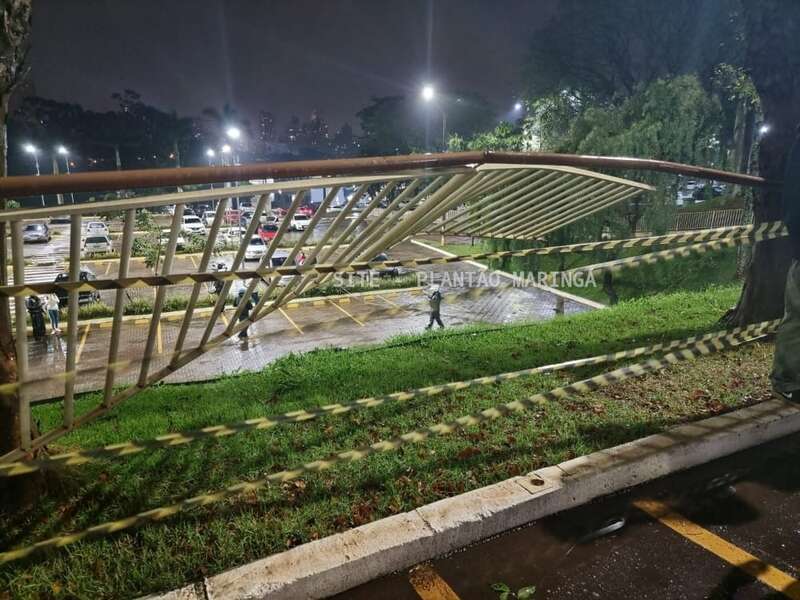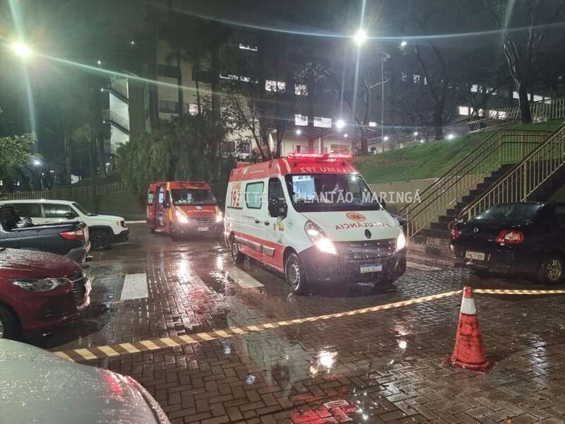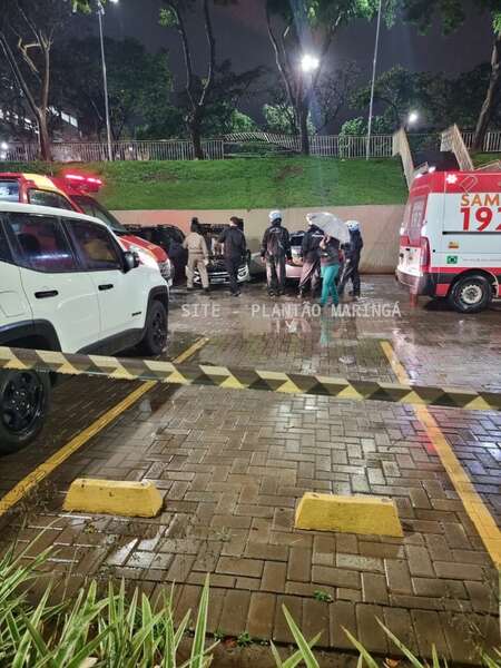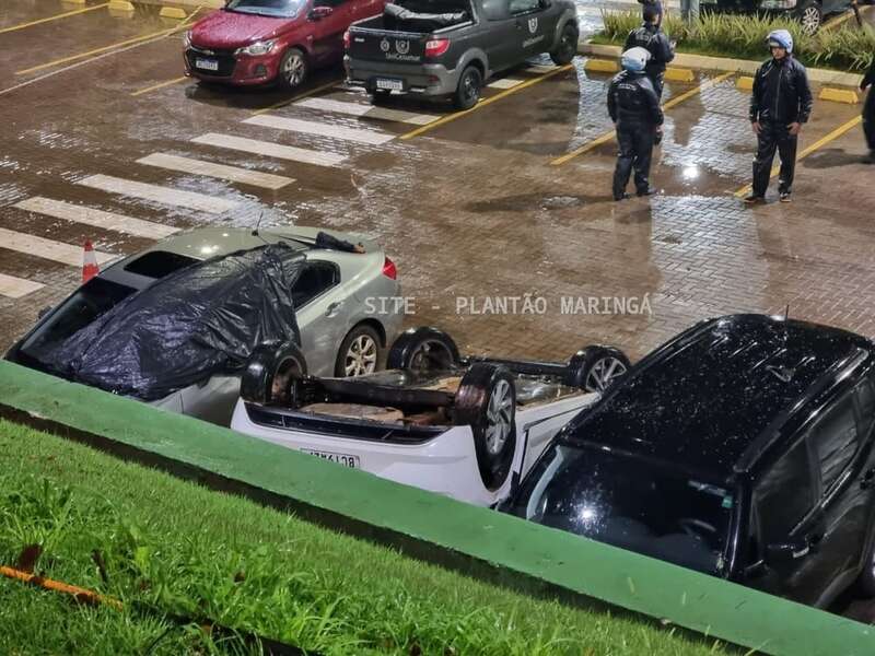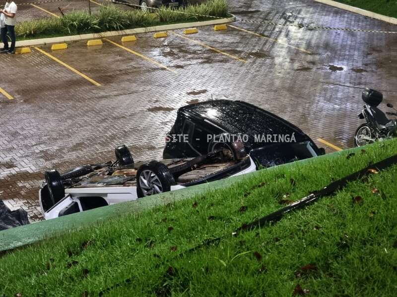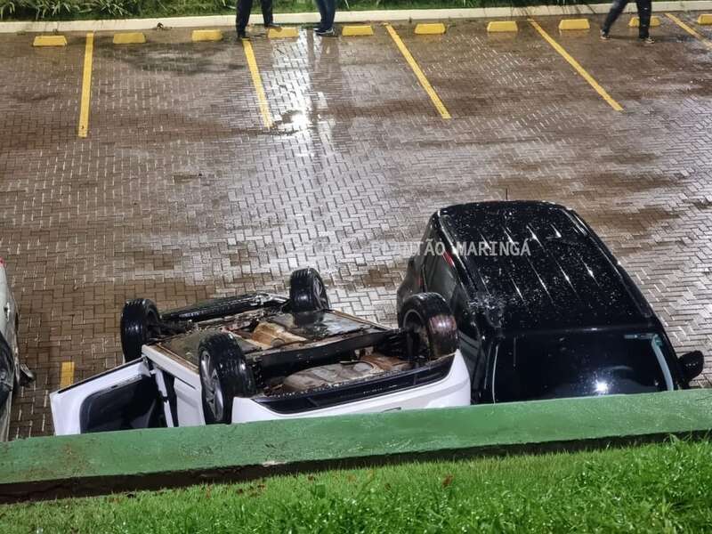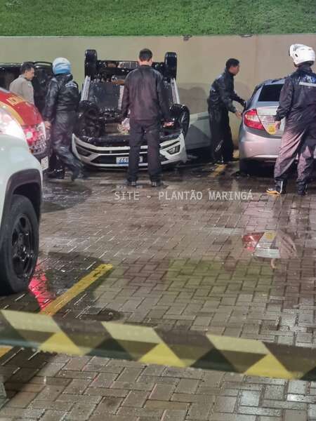 Duas mulheres e um rapaz ficaram feridos depois que o carro em que eles estavam caiu de um estacionamento da Unicesumar, em Maringá, na noite desta quarta-feira (14).