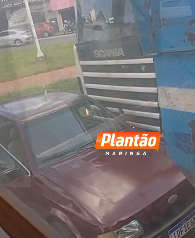 Um carro foi arrastado por uma carreta na tarde desta sexta-feira (23), no Contorno Sul, no cruzamento com a Avenida Gastão Vidigal, em Maringá, no norte do Paraná.