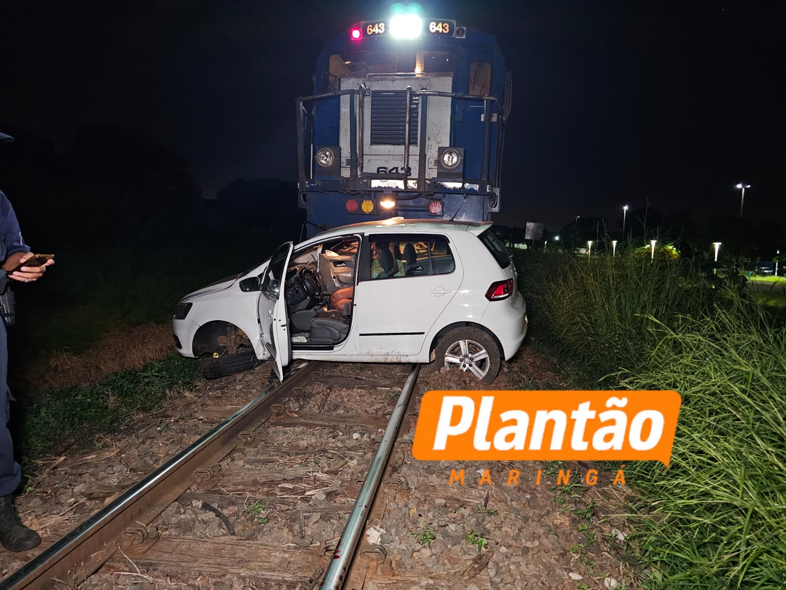 Uma colisão entre uma locomotiva e um veículo deixou duas pessoas feridas na noite deste sábado (31), em Sarandi. O acidente aconteceu no cruzamento da Rua José Munhoz com a linha férrea.