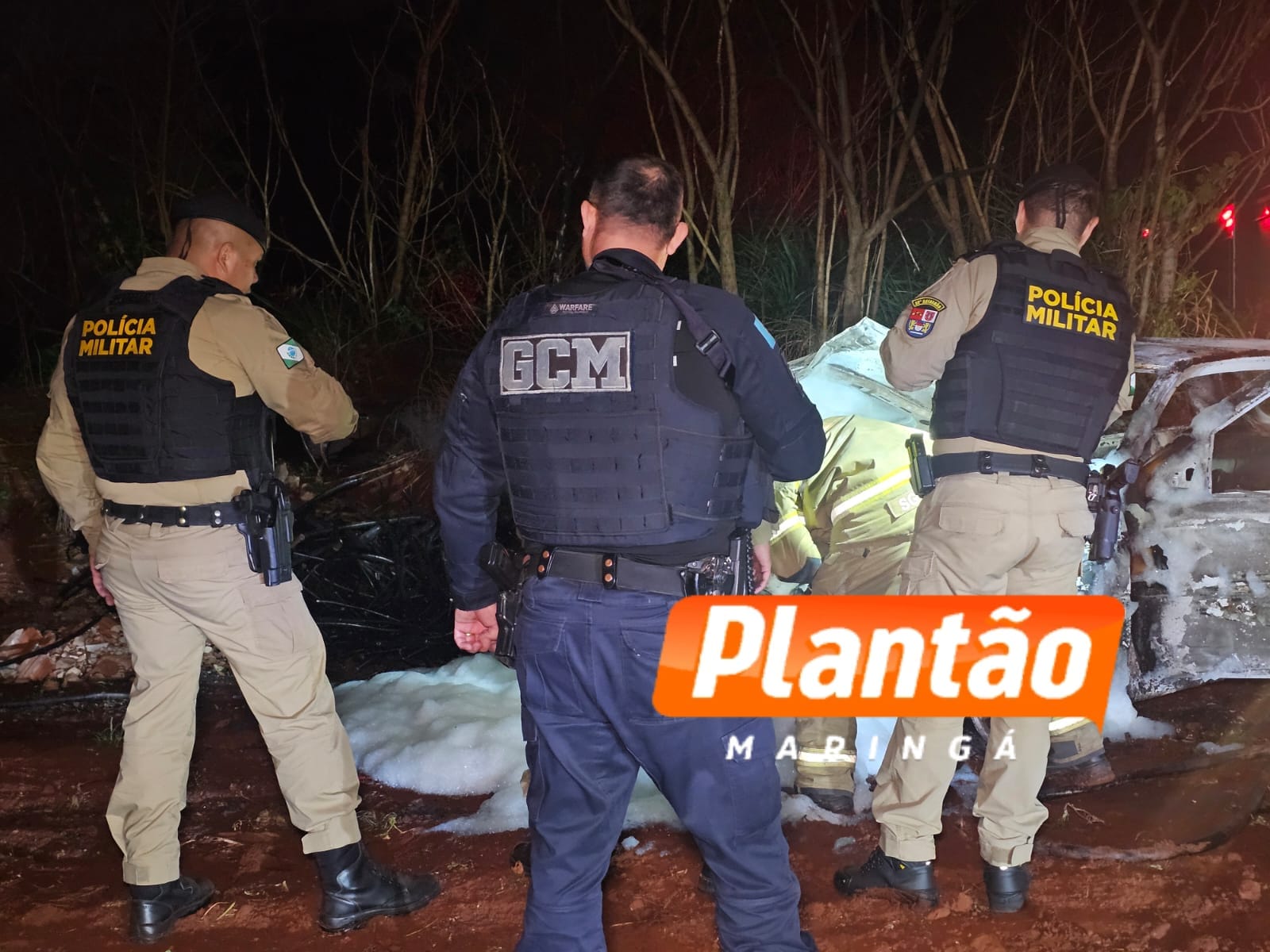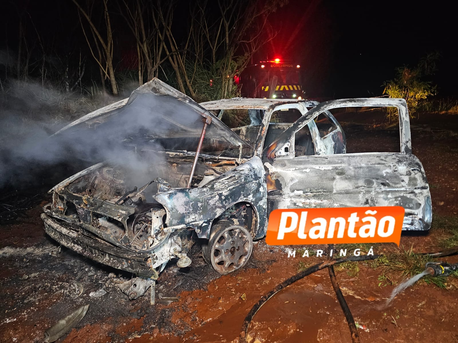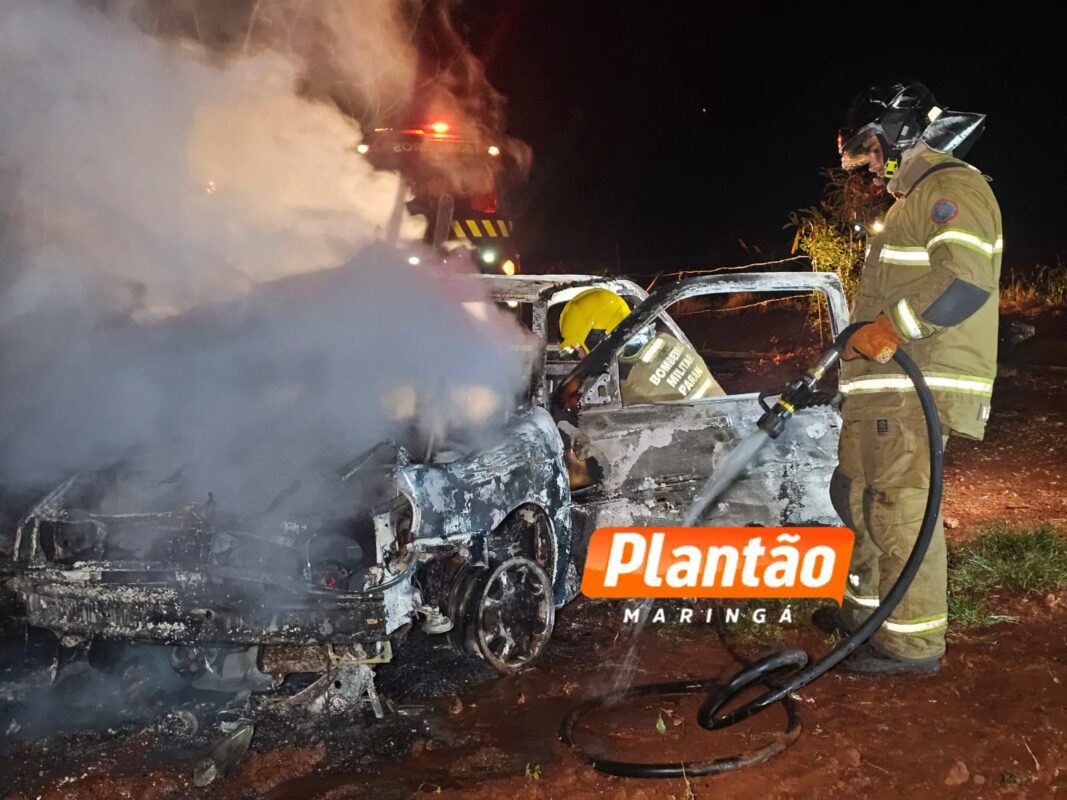 Um carro em chamas foi localizado por equipes da Guarda Civil Municipal e da Polícia Militar na noite desta terça-feira (25), na Estrada do Oito, na zona rural de Sarandi.