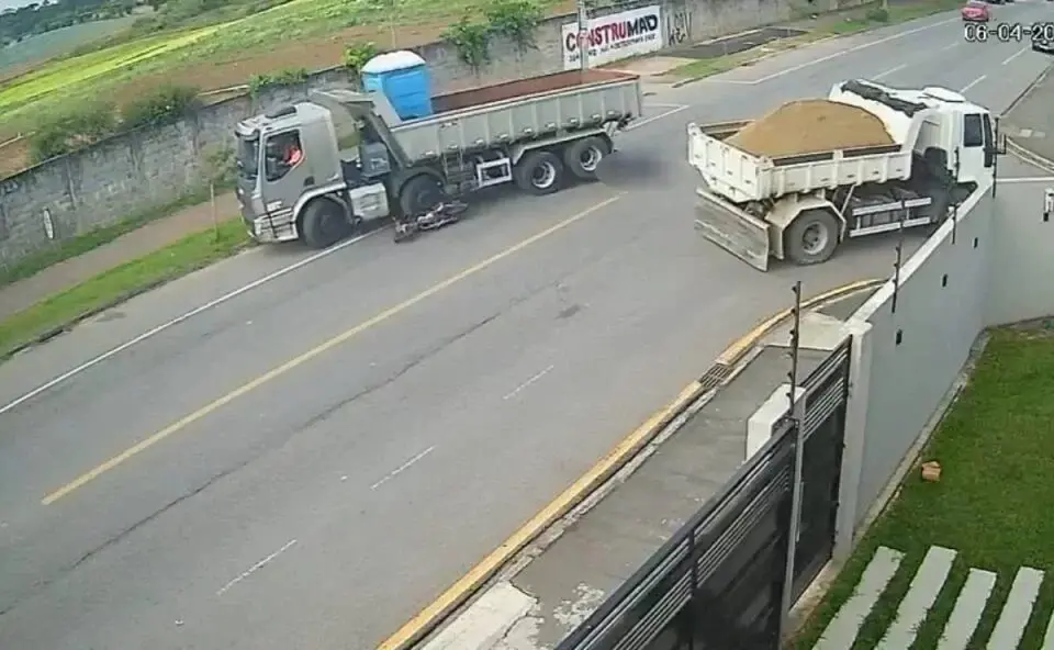 Nas imagens, é possível ver que um segundo caminhão, que seguia pela Rua Eduardo Pinto da Rocha, desacelera para dar passagem para o veículo envolvido no acidente. A moto, pilotada pela vítima, tentou ultrapassar o caminhão e acaba batendo em cheio contra o veículo de carga que entrava na rua. As cenas são fortes.