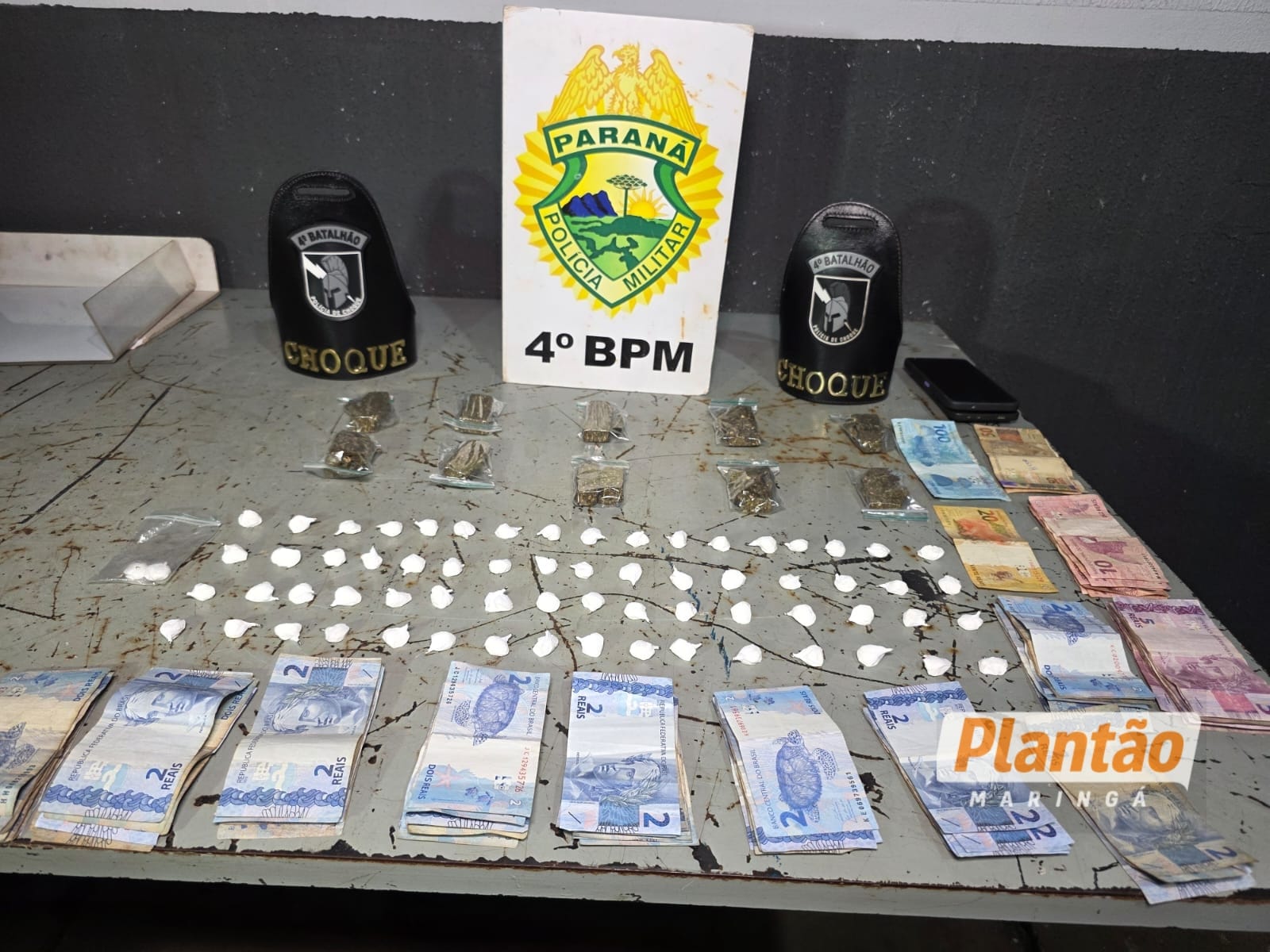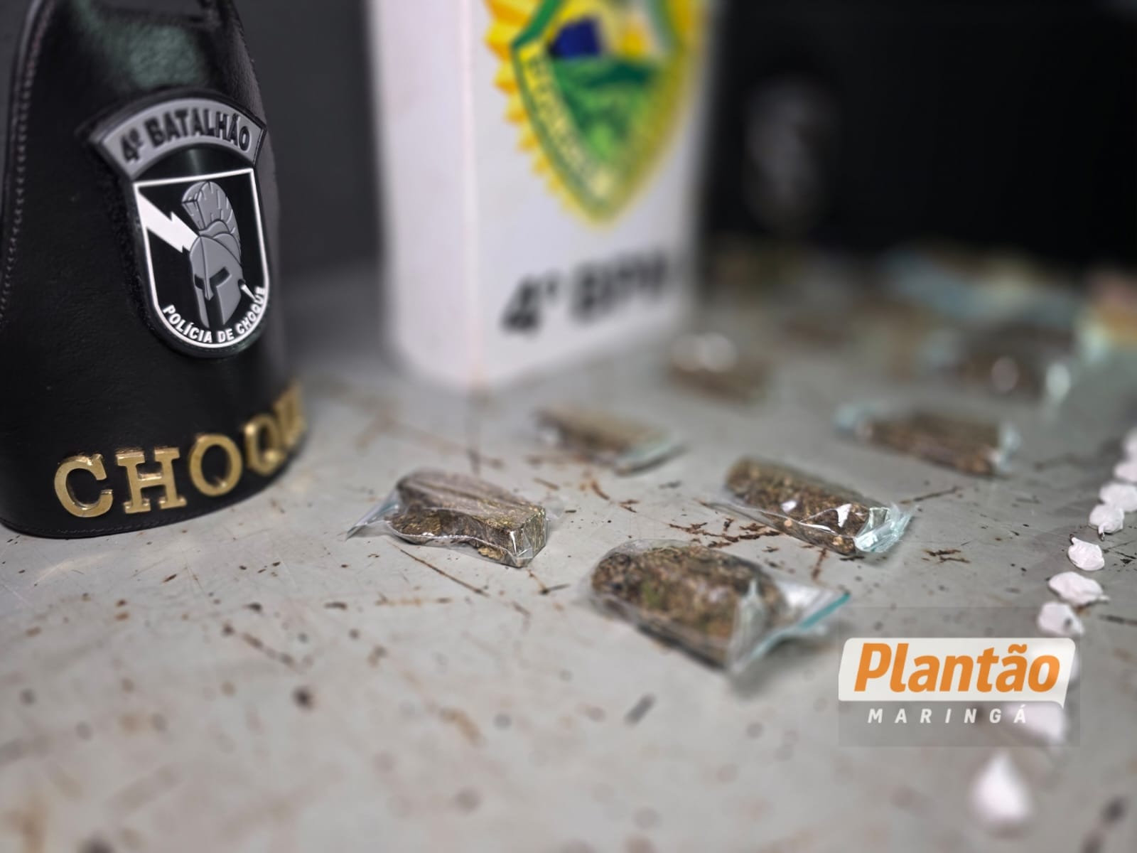 Duas ações distintas da equipe do Choque, do 4º Batalhão da Polícia Militar, resultaram em apreensões e prisões na noite deste sábado (21), em Maringá. A primeira ocorrência foi registrada em um bar localizado na Avenida João Pereira. Segundo denúncias, um indivíduo estaria comercializando drogas no local. Durante a abordagem, os policiais realizaram revista em frequentadores, sendo encontrada uma porção de maconha com um dos suspeitos.