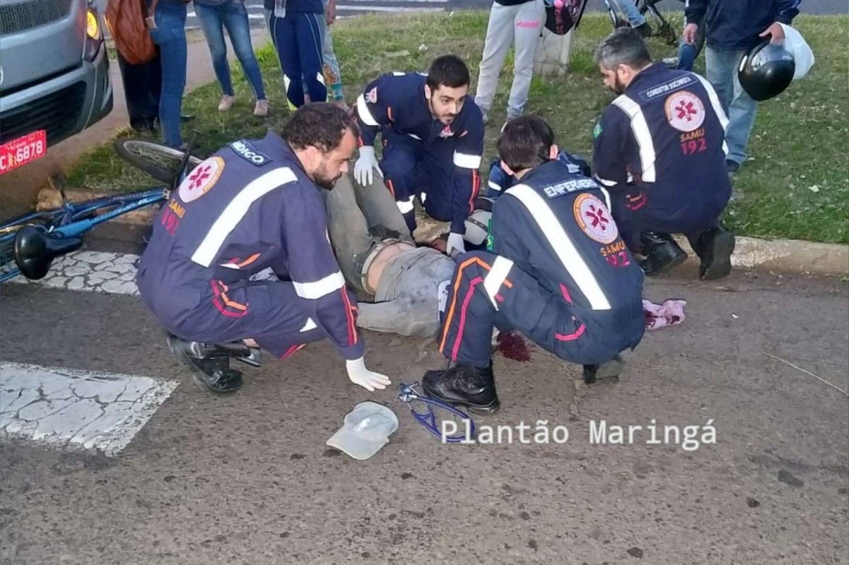 Um ciclista sofreu ferimentos graves após ser atropelado por um ônibus Cidade Verde Transporte Rodoviário no início da noite desta quinta-feira (22), em Maringá. O atropelamento aconteceu no cruzamento Avenida Guaiapó com a Rua Estados Unidos, no bairro Vila Nova.