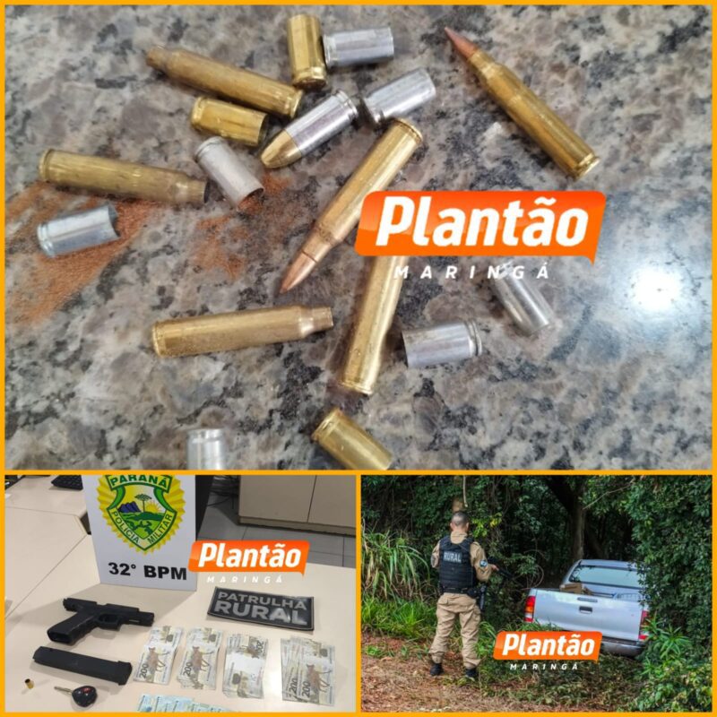 Pouco tempo depois, a equipe da Patrulha Rural localizou o veículo abandonado em meio a uma mata. Dentro da caminhonete, foi encontrada uma cápsula deflagrada, uma pistola com carregador alongado e aproximadamente R$ 7.800 em dinheiro. Todo o material foi apreendido e encaminhado à Delegacia da Polícia Civil de Mandaguaçu.