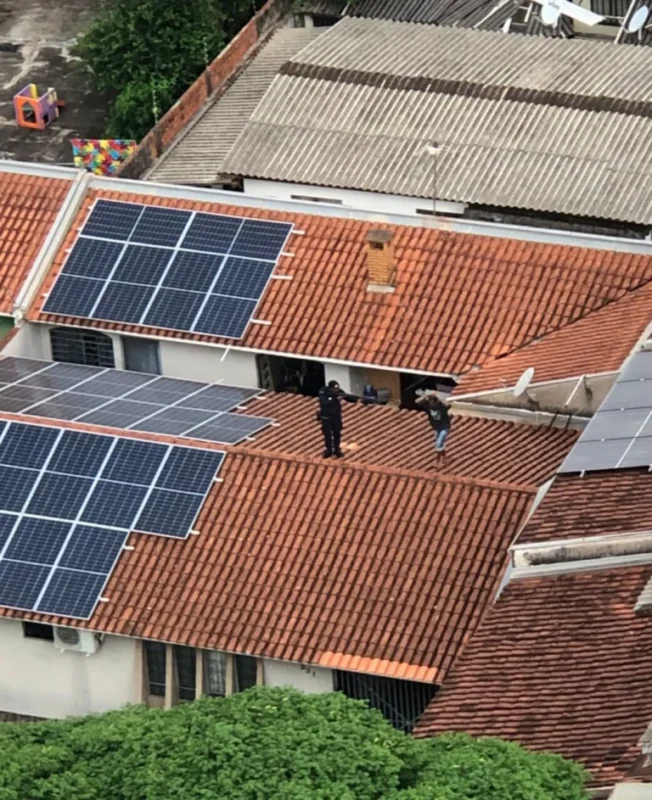Equipes da Polícia Militar também foram direcionadas para a ocorrência para dar suporte à ação. Imagens mostram o momento em que um dos agentes consegue abordar um dos suspeitos no telhado de uma residência, durante a tentativa de fuga.