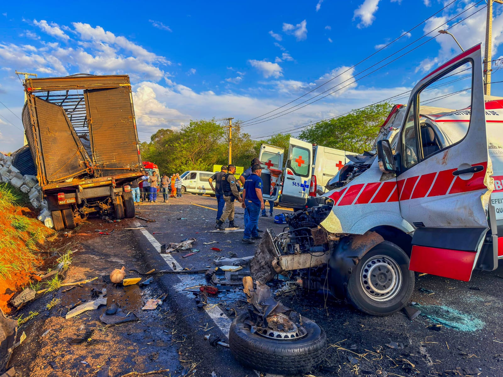 De acordo com informações preliminares, um dos pneus do caminhão estourou, o que fez com que o motorista perdesse o controle da direção, resultando na batida de frente com o veículo de saúde.