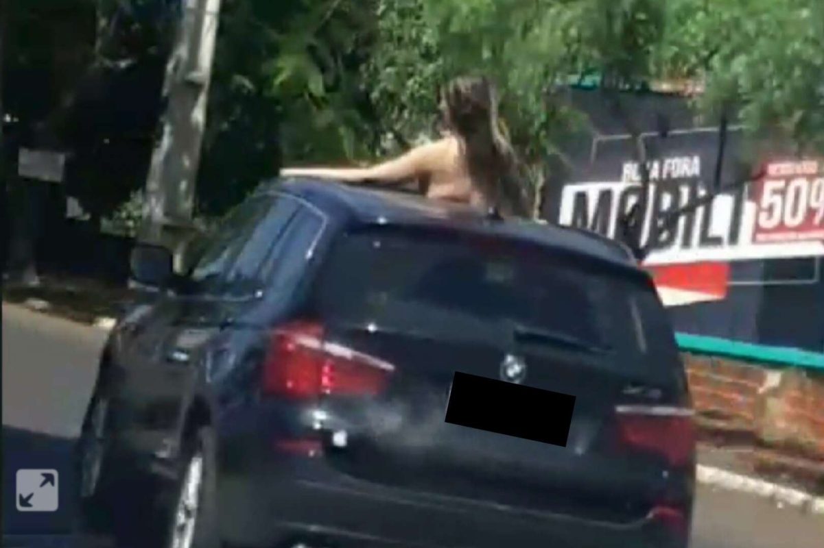 Nas imagens registradas por um cinegrafista amador, é possível ver que a mulher está no teto-solar de uma BMW, com os seios amostra. O vídeo rapidamente viralizou nas redes sociais.