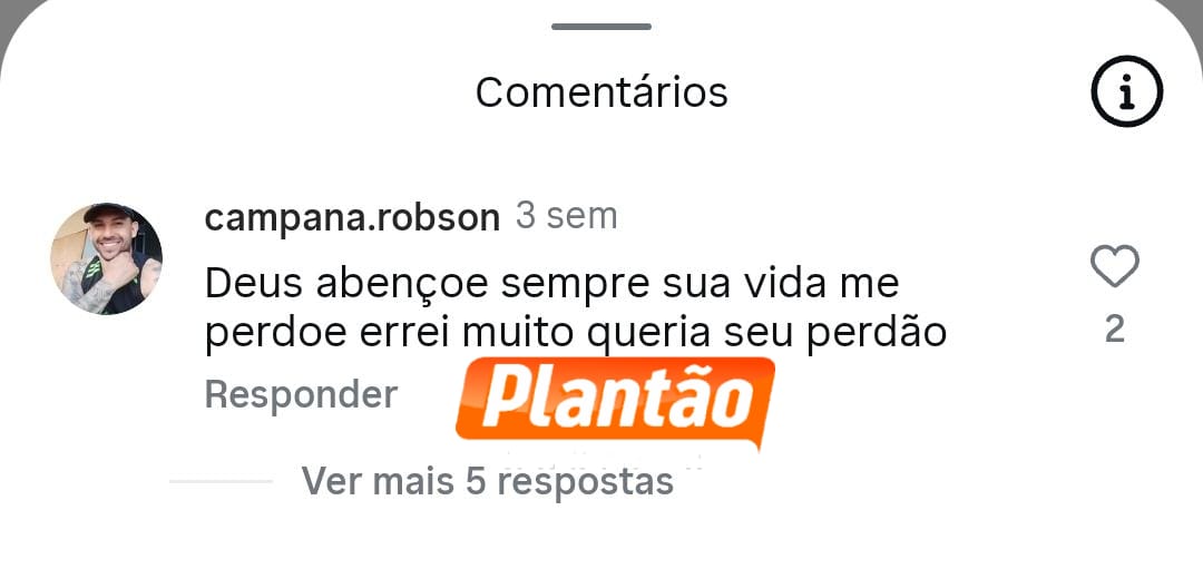 Em um comentário numa postagem da vítima a cerca de 15 dias, Robson pediu perdão. ” Deus abençoe sempre sua vida me perdoe errei muito queria pedir perdão” finalizou o assassino. Veja a entrevista abaixo