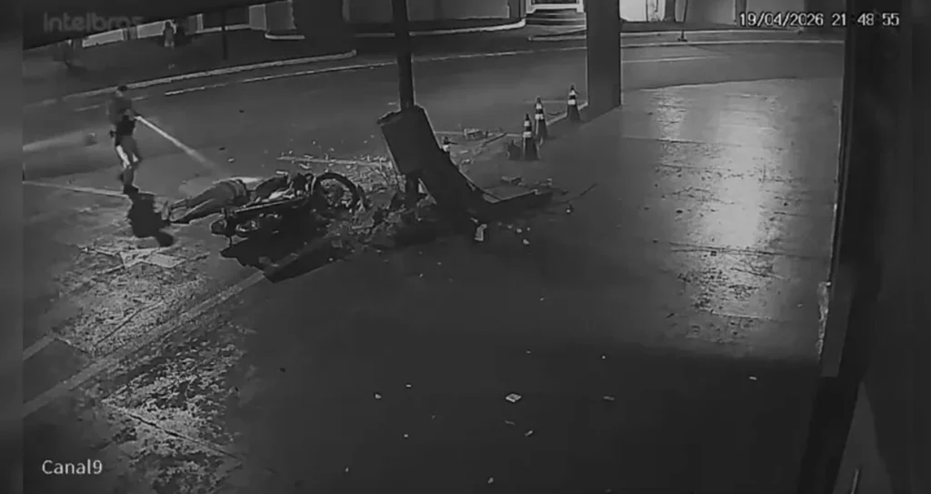 No vídeo, é possível ver a motocicleta em alta velocidade até o momento da batida. Com a força da colisão, a jovem que estava na garupa é lançada contra um poste e cai próxima ao veículo. Logo em seguida, policiais militares se aproximam para verificar a situação e prestar os primeiros atendimentos.