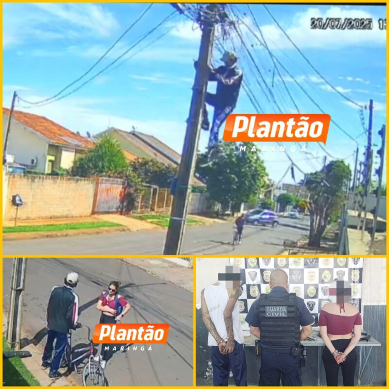 Na tarde deste domingo (20), a Guarda Civil Municipal de Maringá prendeu um casal suspeito de furtar fios elétricos de uma residência no Parque das Grevíleas. A equipe foi acionada via central de rádio após um morador entrar em contato pelo telefone de emergência 153, relatando que dois indivíduos estariam furtando cabos em frente à sua casa. Quando os agentes chegaram ao endereço indicado, os suspeitos já haviam fugido do local.