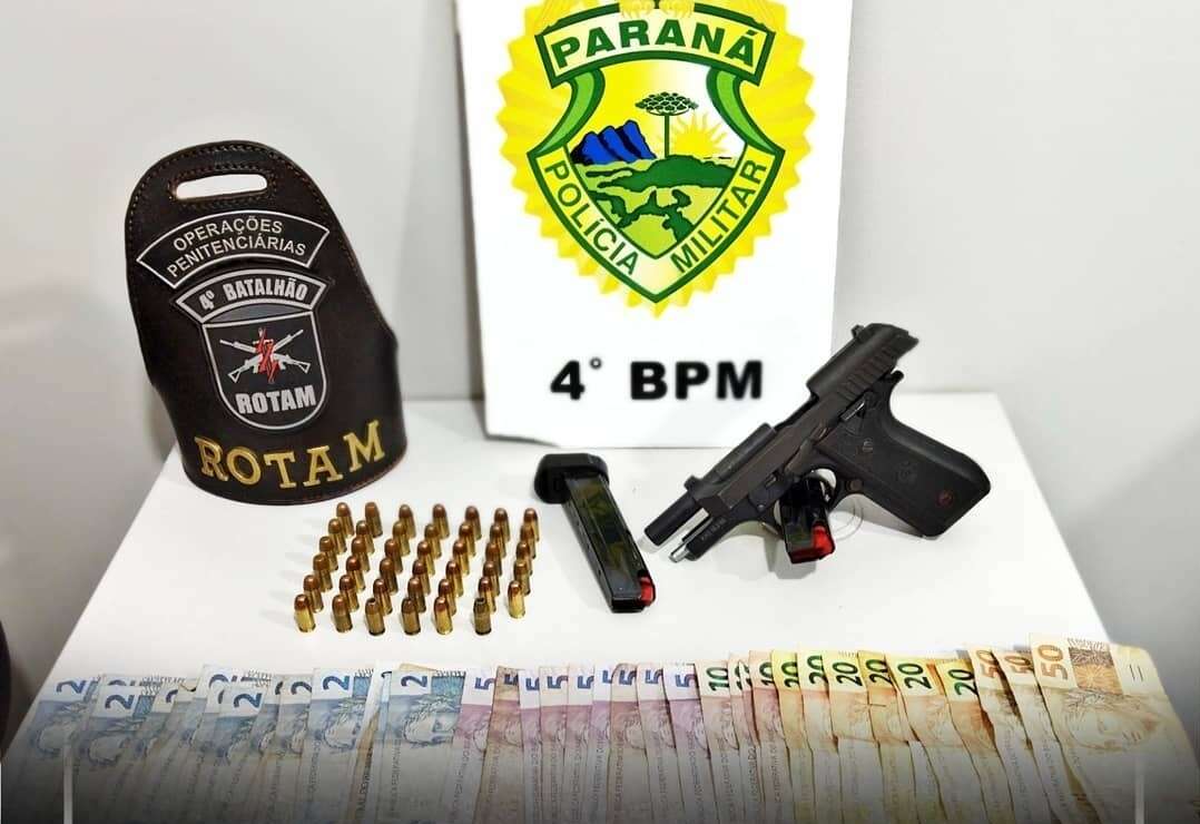 Um casal foi abordado pela equipe da ROTAM de Maringá, que participava de uma operação na cidade e durante a revista pessoal, a equipe encontrou na cintura de Luiz Fernando Gonçalves dos Santos (vulgo tronxo), uma pistola de calibre 380. A arma de fogo estava com um carregador com 21 munições intactas, Um segundo carregador que estava no bolso com outras 20 munições. Foram apreendidos ainda uma quantia de R$ 407,00 reais em dinheiro.
