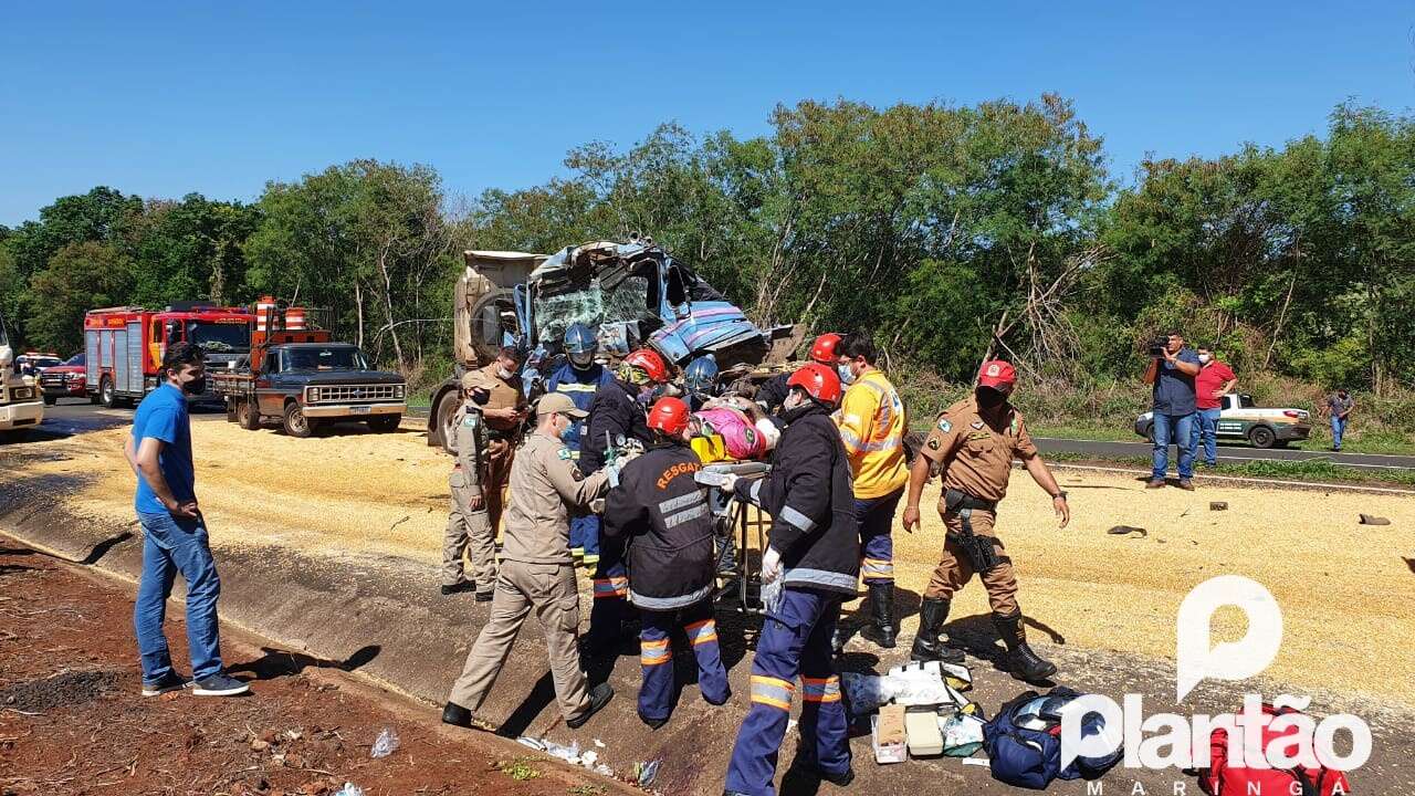 Um motorista ficou gravemente ferido ao bater a carreta que conduzia na traseira de outra carreta carregada de milho. O acidente foi registrado na manhã desta quarta-feira (09), em Maringá.