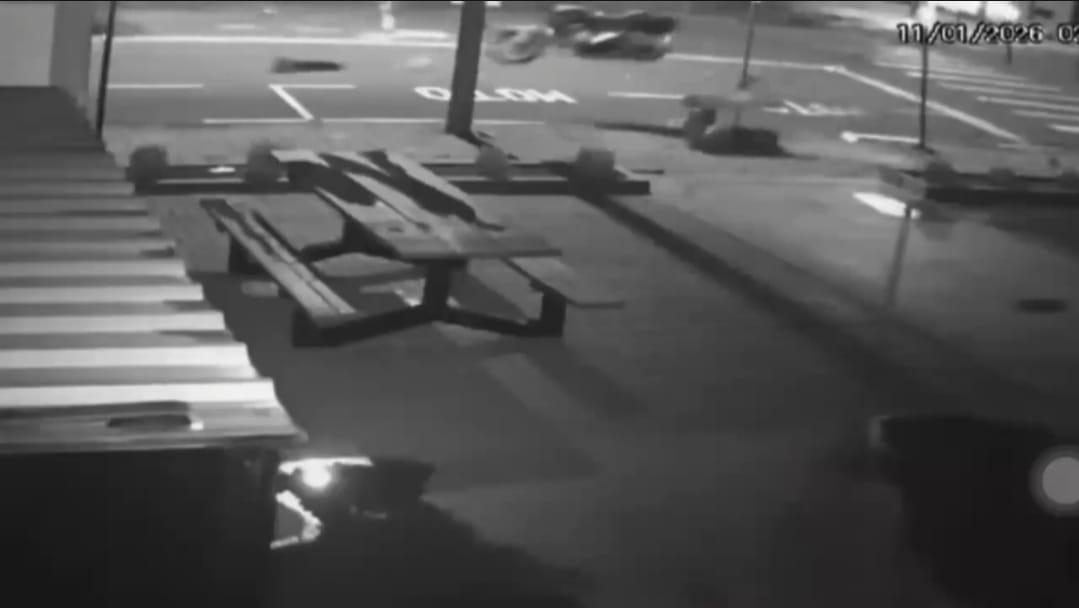 Com a força do impacto, a moto roda várias vezes na pista, chega a ser lançada para o alto. Já o motociclista é arremessado contra a via e uma placa de sinalização, caindo na calçada. As imagens são fortes.