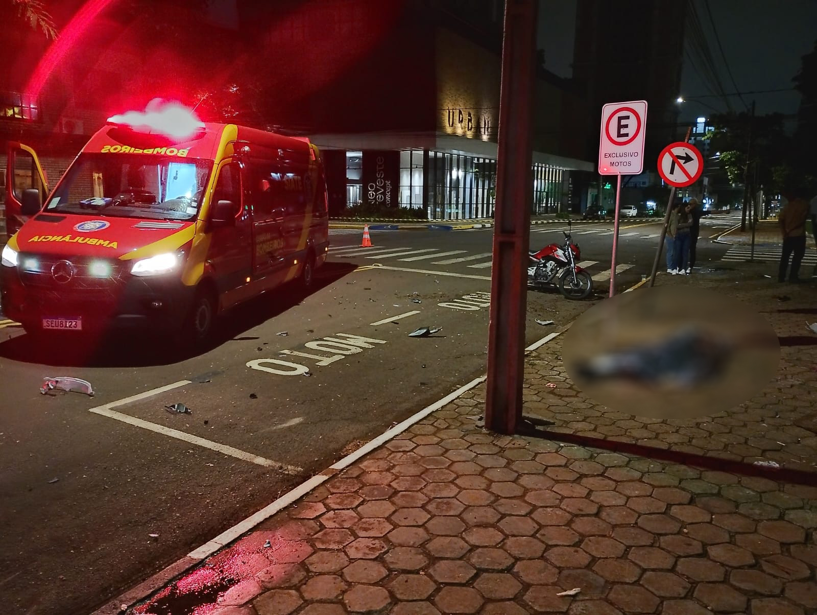 Com a força do impacto, a moto roda várias vezes na pista, chega a ser lançada para o alto. Já o motociclista é arremessado contra a via e uma placa de sinalização, caindo na calçada. As imagens são fortes.