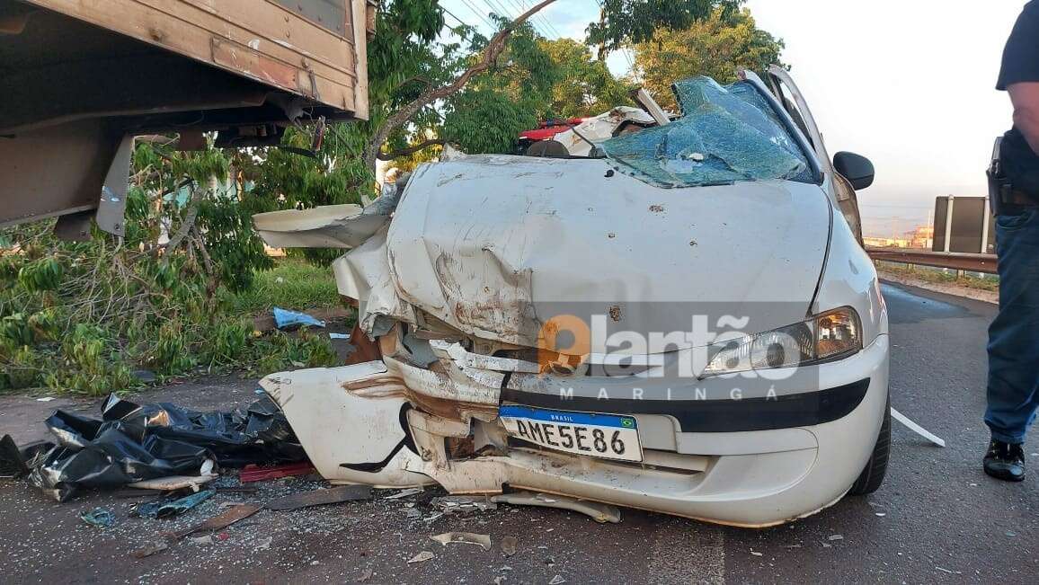 Um jovem, de 25 anos, morreu após o carro em que ele estava bater atrás de um caminhão, no fim da madrugada desta quinta-feira (06), na Rua Almerinda da Silva Coelho (Marginal Contorno Norte), em Maringá.