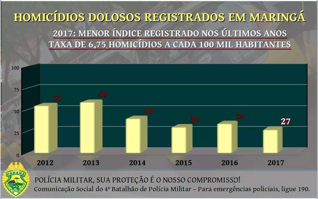 No ano de 2017, o 4º Batalhão de Polícia Militar registrou 27 ocorrências de homicídios dolosos na cidade de Maringá. Este índice gera a taxa de 6,75 homicídios a cada 100 mil habitantes, a menor registrada nos últimos anos e abaixo do aceitável pela Organização das Nações Unidas, que é a proporção de 10 homicídios.