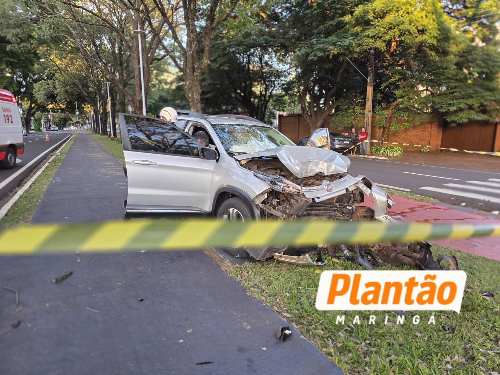 O carro subiu no canteiro central, percorreu alguns metros pela ciclovia e acabou atingindo uma lixeira e, em seguida, uma árvore.