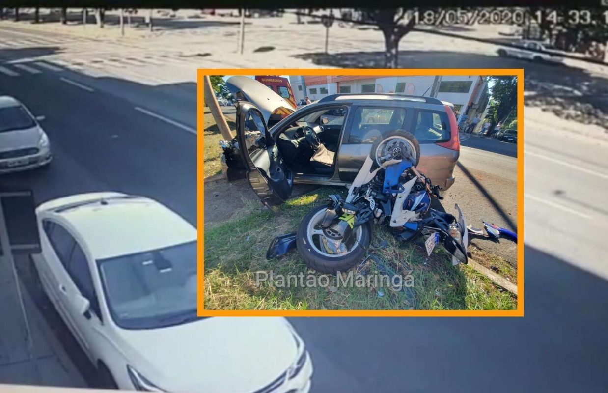 A colisão envolveu um veículo Peugeot que era conduzido pela empresária, Olga Noriko Hirama, de 61 anos, e uma moto esportiva JTA/Suzuki 1.000 cilindradas. Erick Mosconi, um comerciante de 27 anos, pilotava a motocicleta. Ele foi socorrido apresentando ferimentos graves. A princípio o motociclista sofreu fratura nos braços e pernas. Já a condutora do automóvel, sofreu ferimentos moderados e passa bem. O acidente ocorreu no cruzamento da Avenida Colombo, com a Rua Santana, na zona 6.