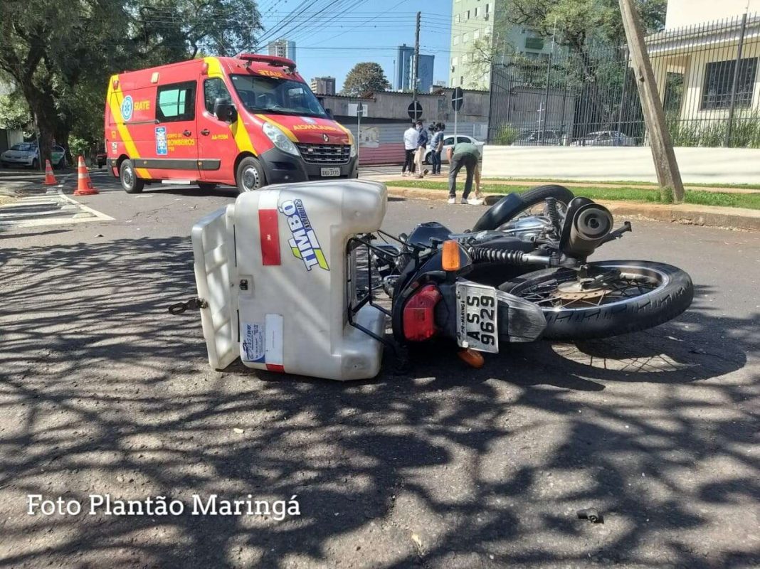 Matheus Dias de Oliveira, de 21 anos bateu a moto que pilotava em uma picape Fiat Strada. O motociclista trafegava pela Rua Padre Vieira, sentido a Avenida Colombo. No cruzamento, ele avançou a via preferencial e colidiu contra a utilitário. Com a violência do impacto, o rapaz foi lançado a vários metros. Na queda, o motoboy que trabalha em um restaurante entregando marmitas, bateu com a cabeça no asfalto e sofreu um grave traumatismo craniano. Para atender a vítima foi mobilizada uma equipe de socorristas do SIATE além do Veículo de Intervenção Rápida do Bombeiros/SAMU. O motorista da caminhonete nada sofreu. Uma equipe do Pelotão de Trânsito atendeu a ocorrência.