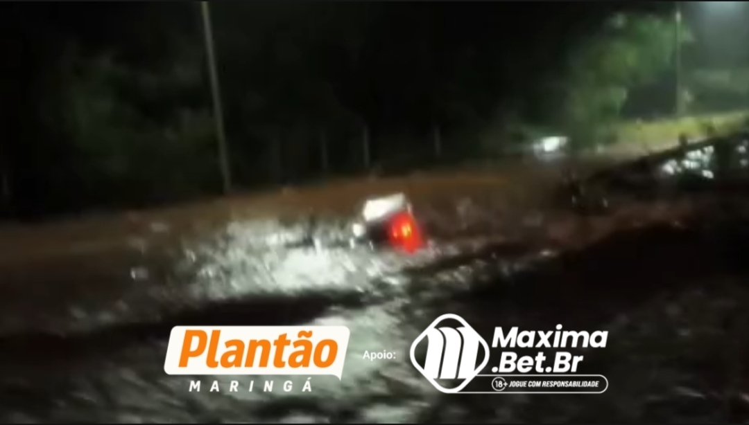 Um motoboy quase foi arrastado pela correnteza de um córrego que transbordou sobre a marginal do Contorno Norte, entre as avenidas Pedro Taques e Tuiuti, em Maringá.