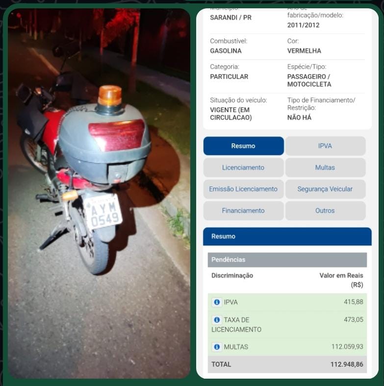 Na noite desta quinta-feira, 12, agentes da Secretaria de Mobilidade Urbana (SEMOB) realizaram a abordagem de uma motocicleta na Rua dos Gerânios, no Jardim Iguaçú, em Maringá. Durante o patrulhamento de rotina, foi constatado que a motocicleta possuía o licenciamento vencido e acumulava débitos que ultrapassam R$ 112 mil.