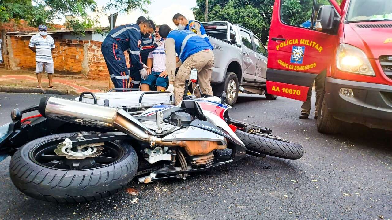 Na tarde desta segunda-feira (14), um motociclista, de 52 anos, sofreu ferimentos graves após um acidente no cruzamento da Rua Pioneiro Antônio Tait, com a Rua Guerino Baldo, no bairro Jardim São Silvestre, em Maringá. Ele seguia pela preferencial quando atingiu a lateral da caminhonete que cruzou na sua frente.
