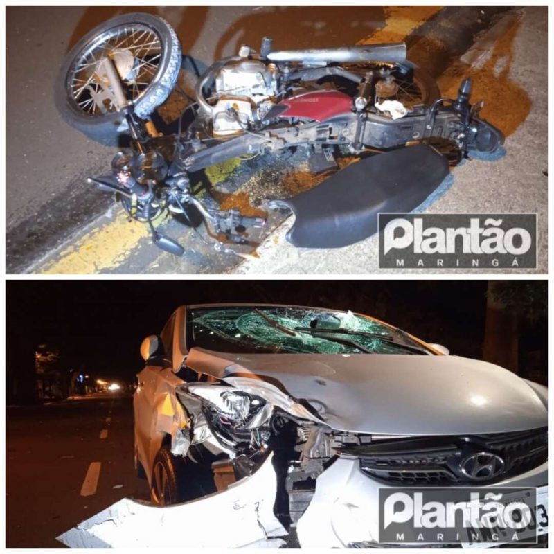 A motocicleta atingiu o carro, a vítima foi arremessada do outro lado da avenida. O acidente aconteceu na noite desta sexta-feira (26). Renan Paladini, de 20 anos, sofreu múltiplas fraturas e foi encaminhado ao Hospital Universitário. Com o impacto da batida, a motocicleta ficou destruída.