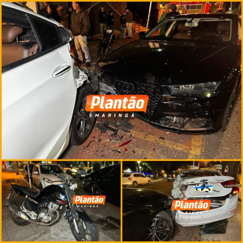 Um acidente impressionante foi registrado na noite desta sexta-feira (13), na Praça Manoel Ribas, região central de Maringá. O condutor de um Audi A7 perdeu o controle da direção e colidiu contra cinco carros estacionados e uma motocicleta. Um dos veículos ficou completamente destruído com o impacto.