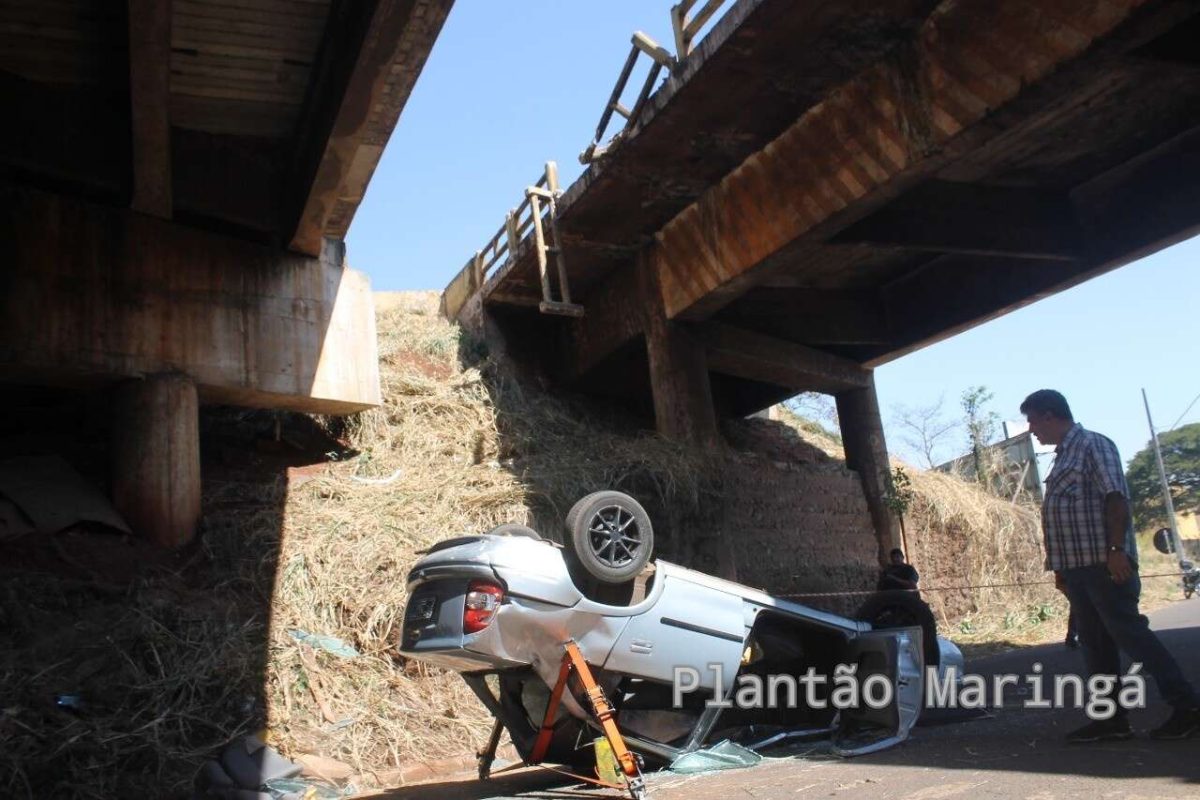 Uma motorista, de 34 anos, foi socorrida com ferimentos moderados após despencar de um viaduto no Parque Industrial, em Maringá, no inicio da tarde desta quinta-feira (22). Segundo as primeiras informações pelo repórter cinematográfico, o veículo seguia na PR-317, nas proximidades da Cocamar, quando foi fechada por outro veiculo e caiu de uma altura de seis metros. O acidente mobilizou socorristas do Corpo de Bombeiros, além da equipe médica do SAMU. A condutora identificada com Marcilene de Souza Jorge foi levada consciente ao Hospital Bom Samaritano.