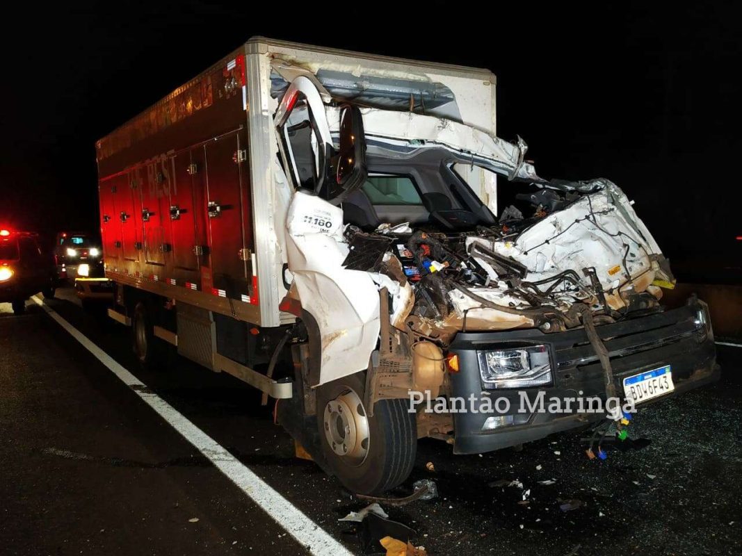 Leandro Danaire da Conceição, de 38 anos5 sofreu ferimentos moderados em um acidente violento registrado na noite deste sábado, nas imediações do Aeroporto de Maringá. Conceição conduzia um caminhão baú câmara fria com placas de Londrina, que atingiu a traseira de uma carreta. O acidente ocorreu na PR-317, sentido perímetro urbano de Maringá. O profissional do volante ficou preso entre às ferragens da cabine, e teve que ser resgatado pelas equipes do Corpo de Bombeiros, SAMU e Concessionária VIAPAR. A frente do caminhão ficou totalmente destruída. Apesar da violência do acidente e da cinemática do ocorrido, o motorista foi socorrido consciente e orientado. A batida aconteceu em um trecho de subida. Luiz Rodrigues, de 61 anos, condutor da carreta, relatou que carregou o veículo em Floresta-PR, 28 toneladas de milho e que iria descarregar em uma cooperativa de Maringá. Ainda disse que desenvolvia baixa velocidade, até por conta da carga, quando de repente ouviu um estrondo na traseira da carreta. Ele parou o veículo e foi verificar o que havia ocorrido, e se deparou com o caminhão baú batido e o motorista preso nas ferragens. Rapidamente ele acionou o socorro. Patrulheiros da Policia Rodoviária Estadual, estiveram no local.